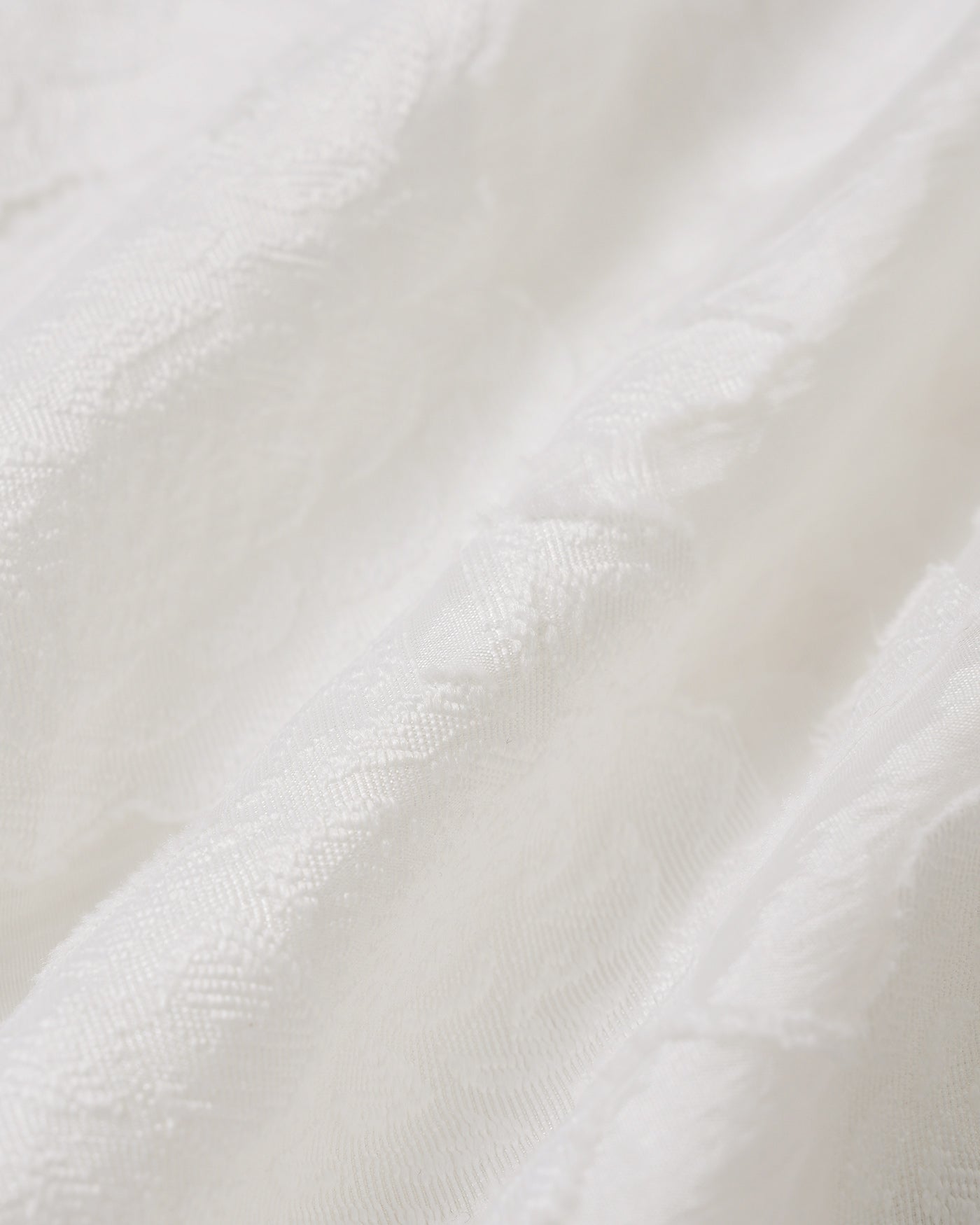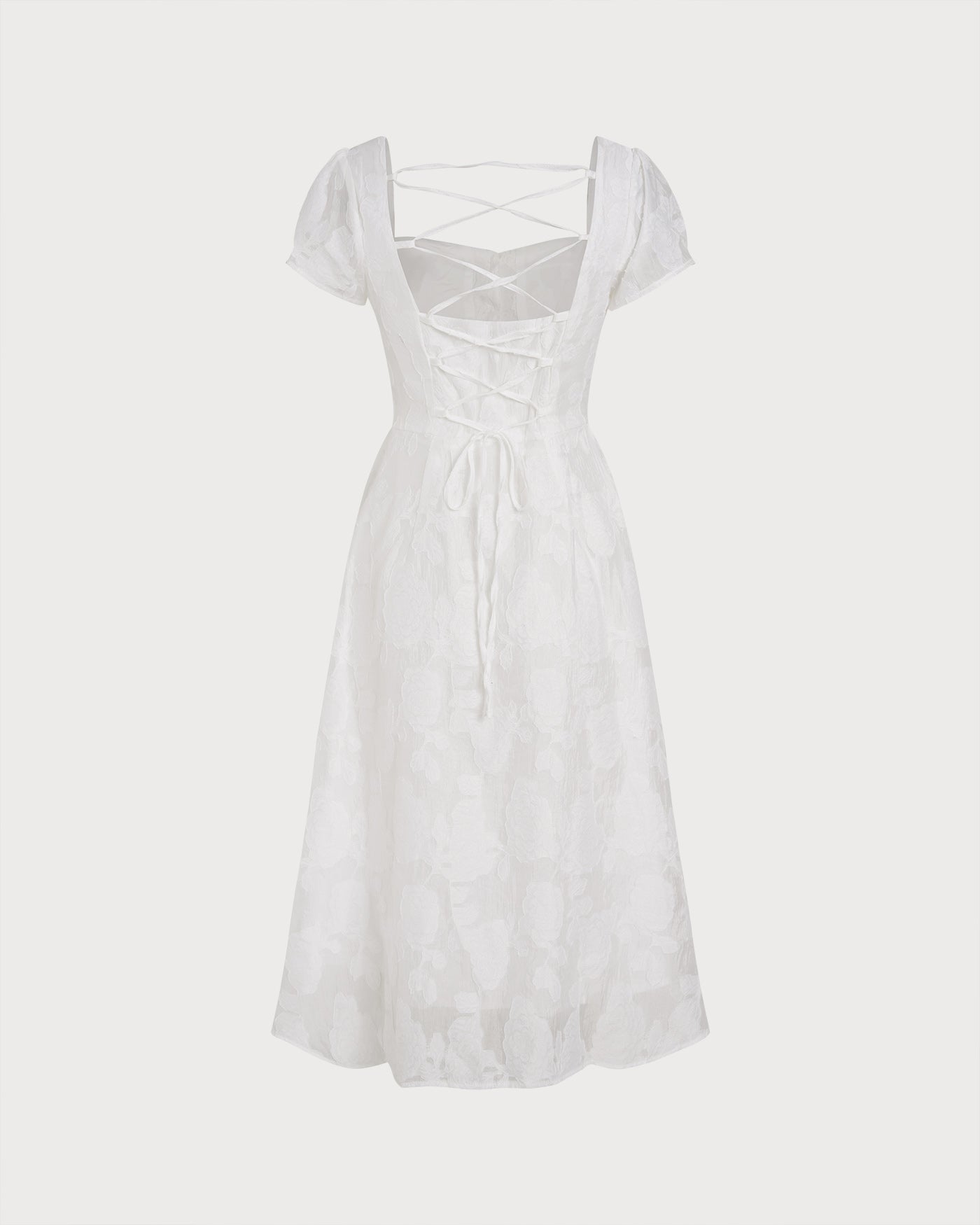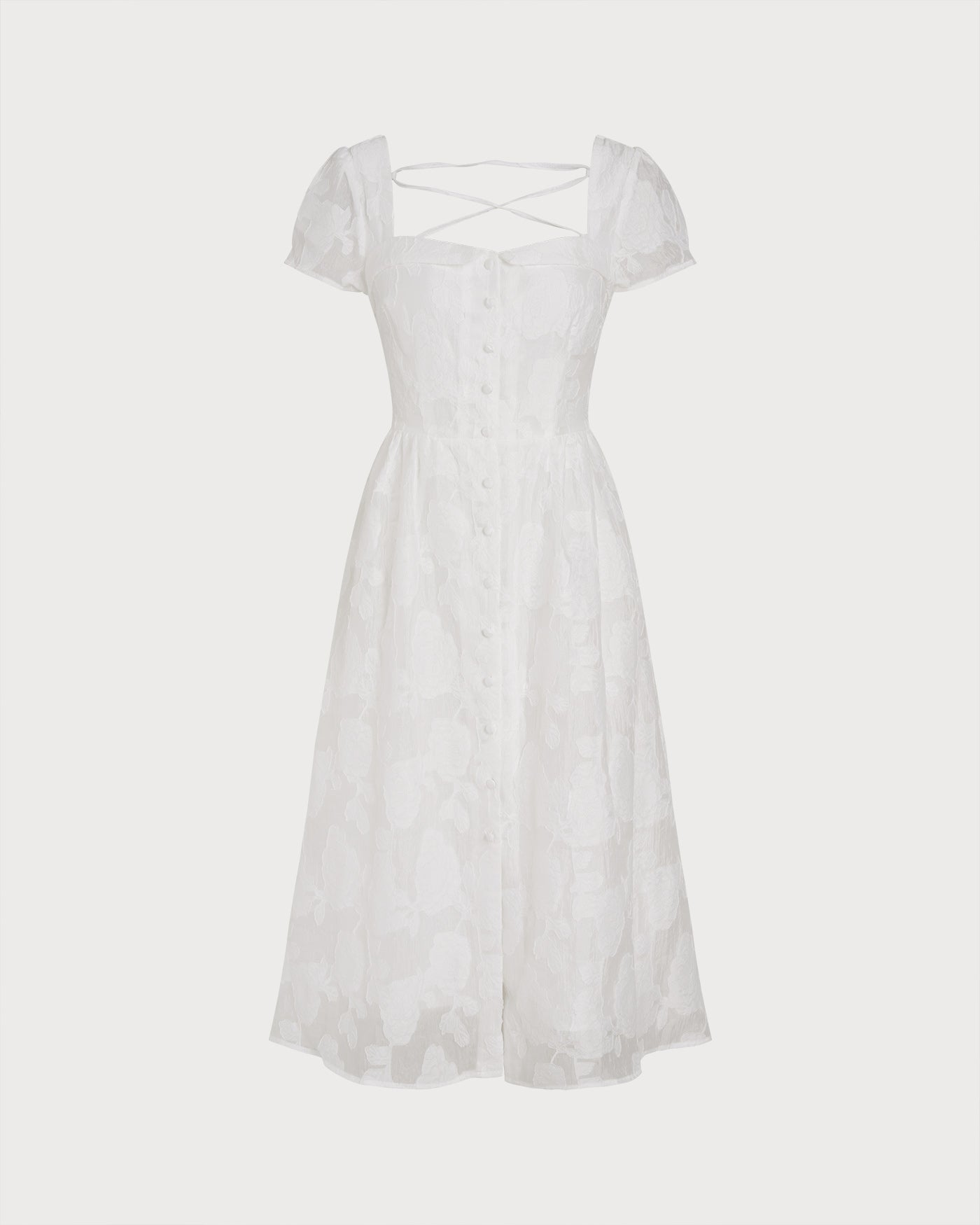 Description: Step into timeless romance with our White Textured Floral Midi Dress. Designed for elegant daily wear or special spring events, this dress features a beautiful, raised botanical floral texture woven into crisp white fabric. The tailored bodice is framed by a flattering square neckline and delicate short sleeves, complete with a classic button-front detail that adds a touch of vintage charm.
