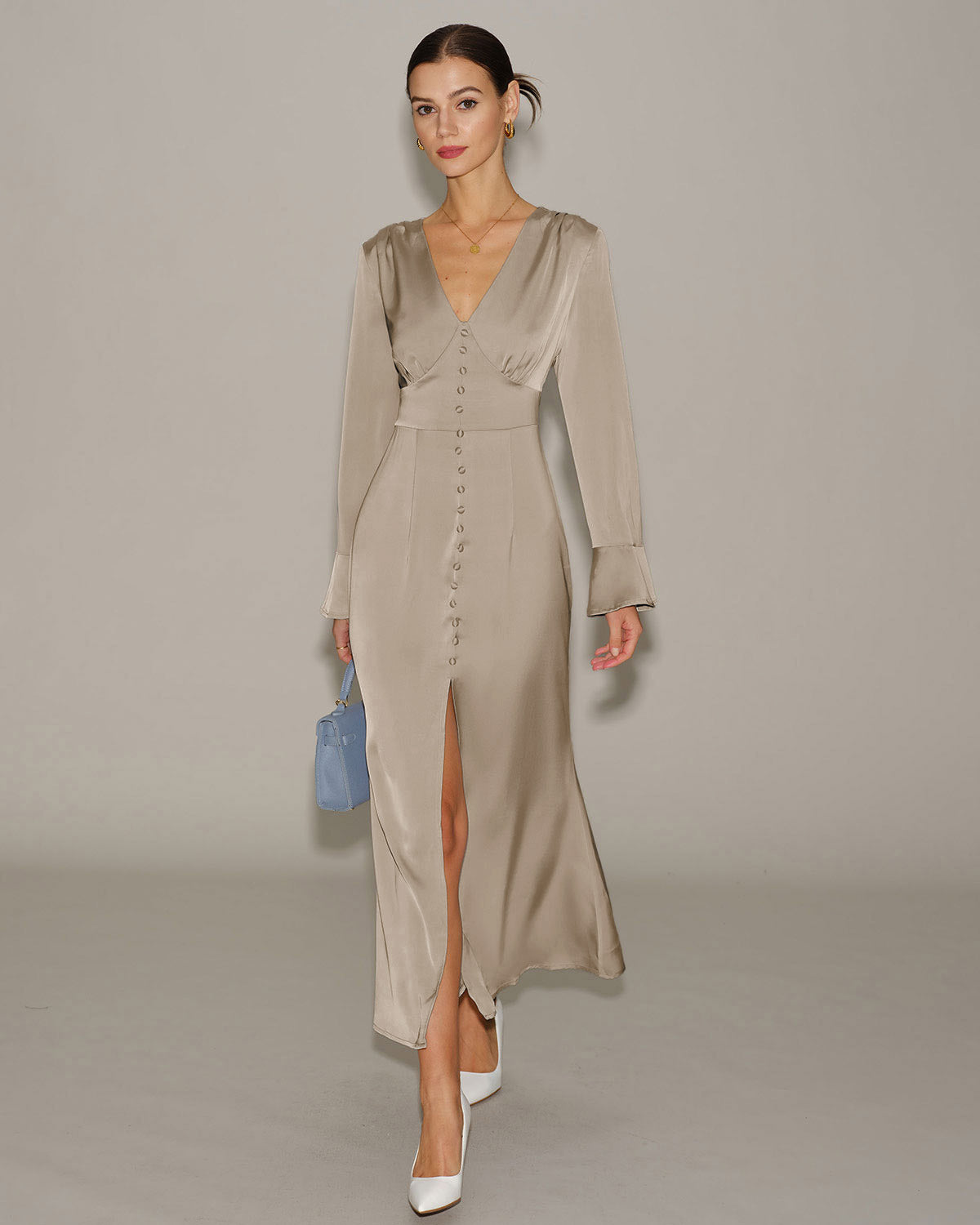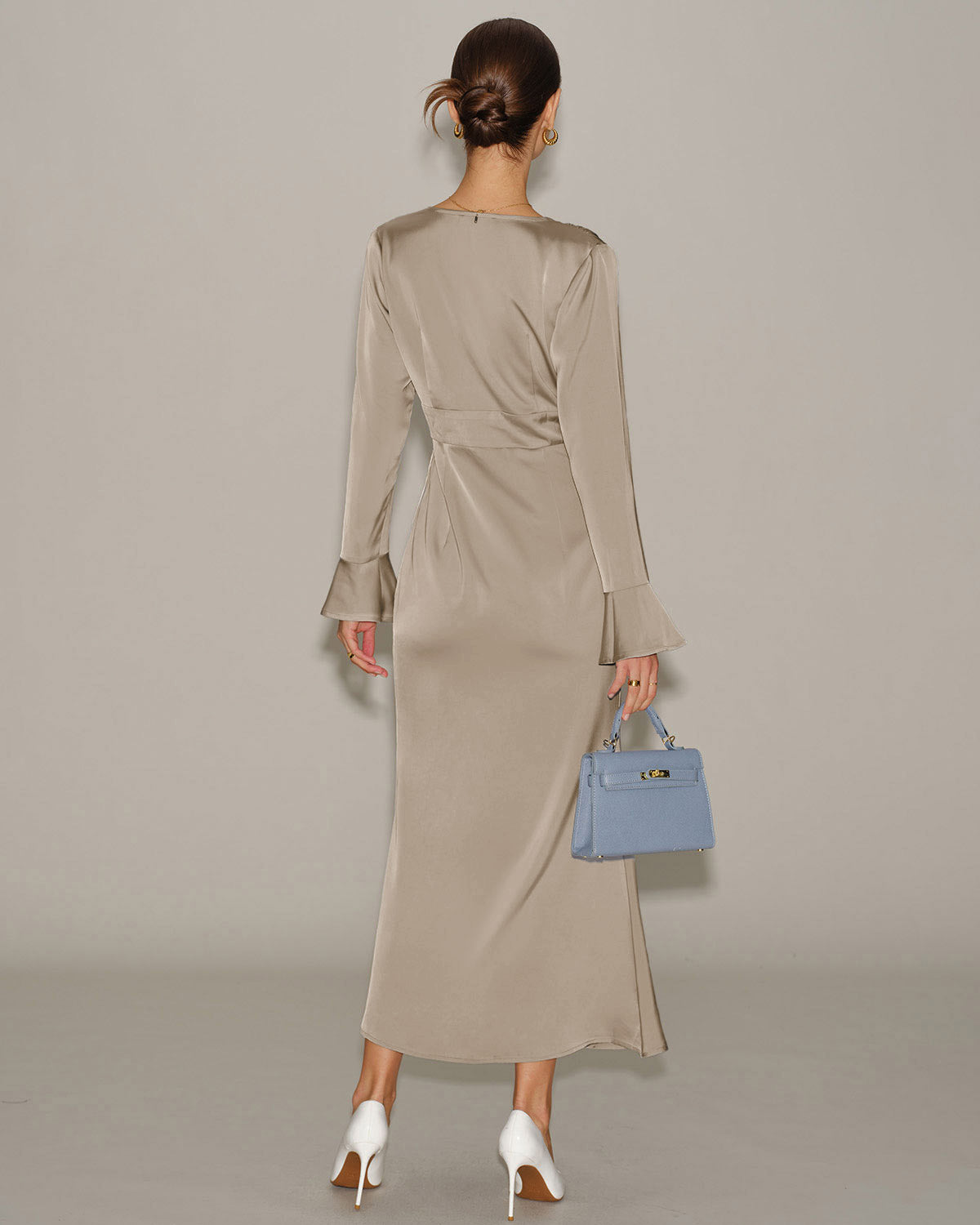 Khaki Satin V Neck Bell Sleeve Maxi Dress