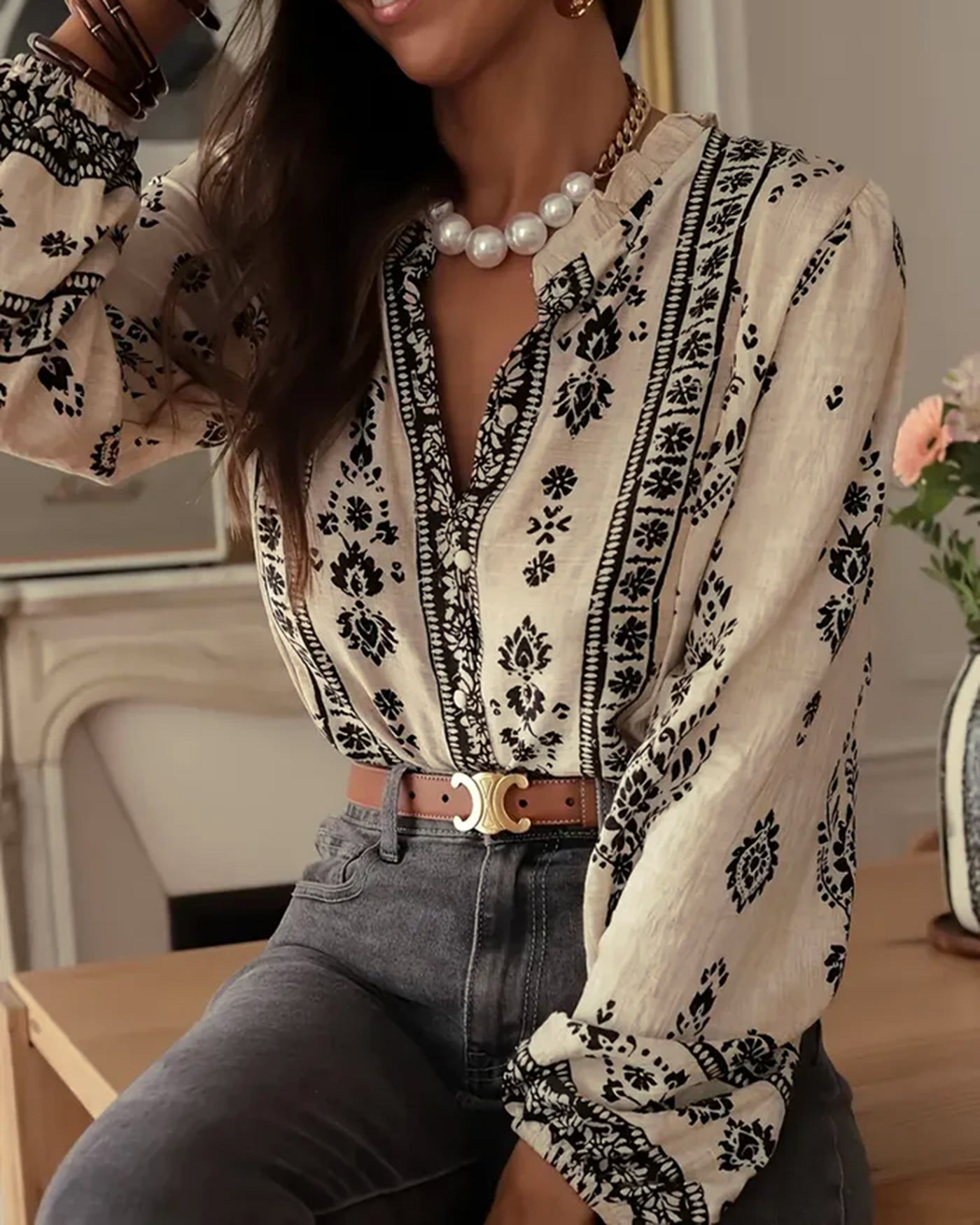 Apricot Floral Ruffled Bishop Sleeve Shirt