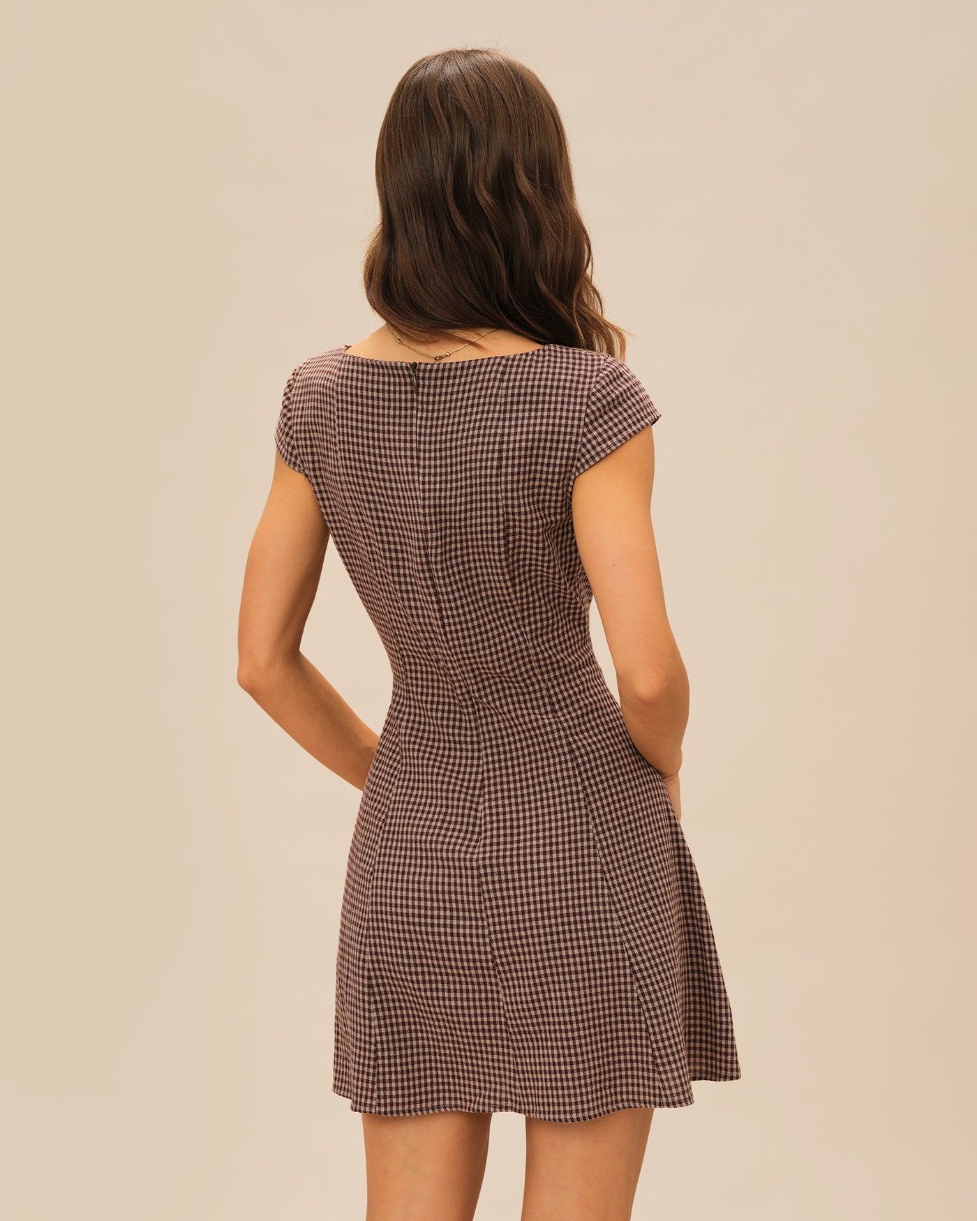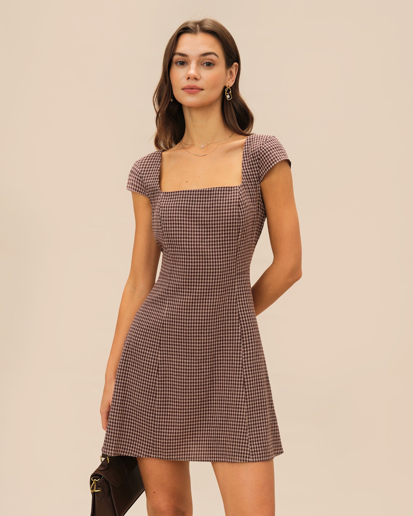 Brown Square Neck Plaid Mini Dress