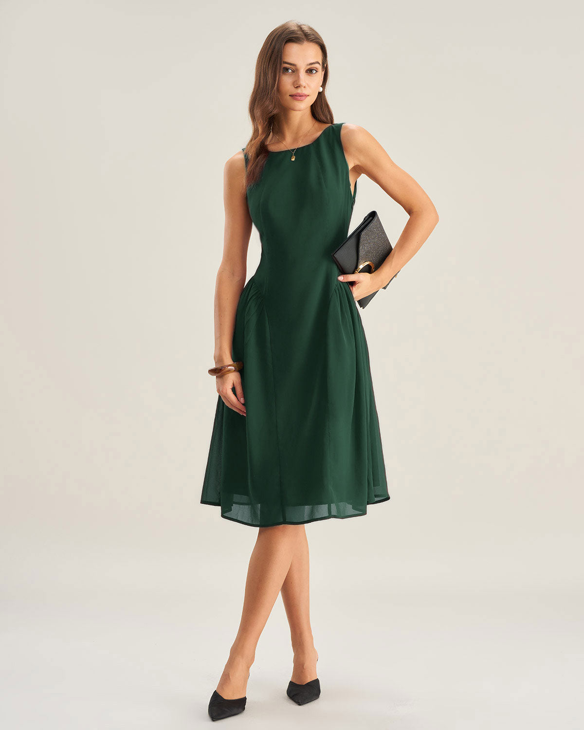 Green Boat Neck Chiffon Midi Dress