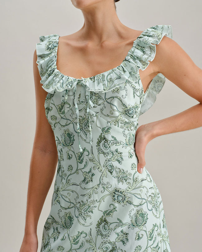 Grünes, gerüschtes Midikleid mit Blumenmuster und quadratischem Ausschnitt