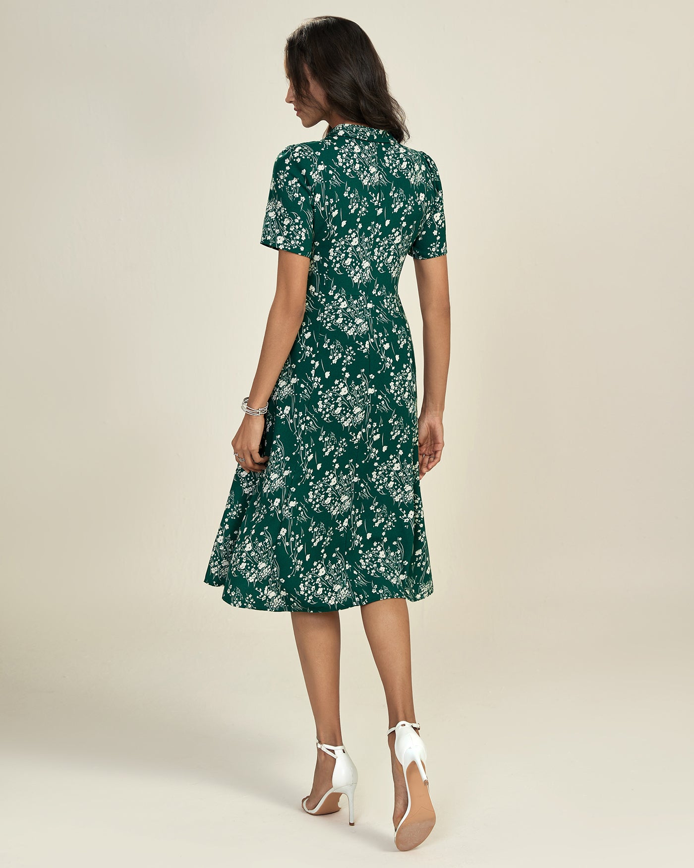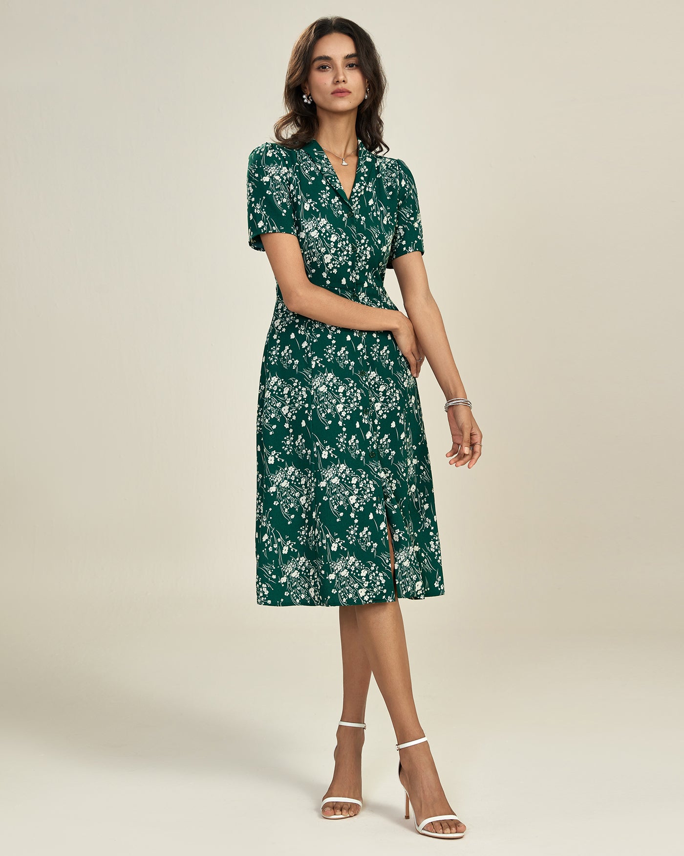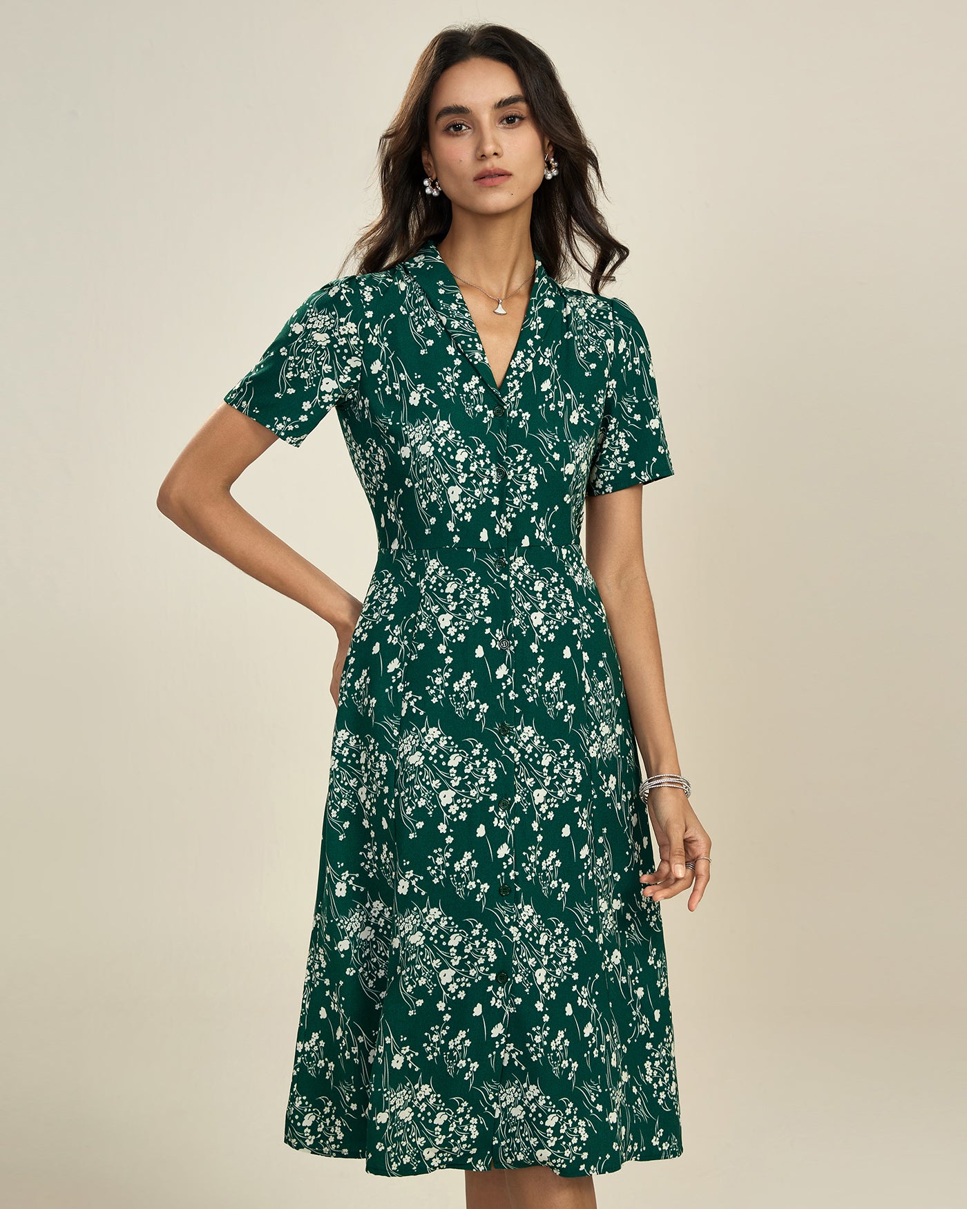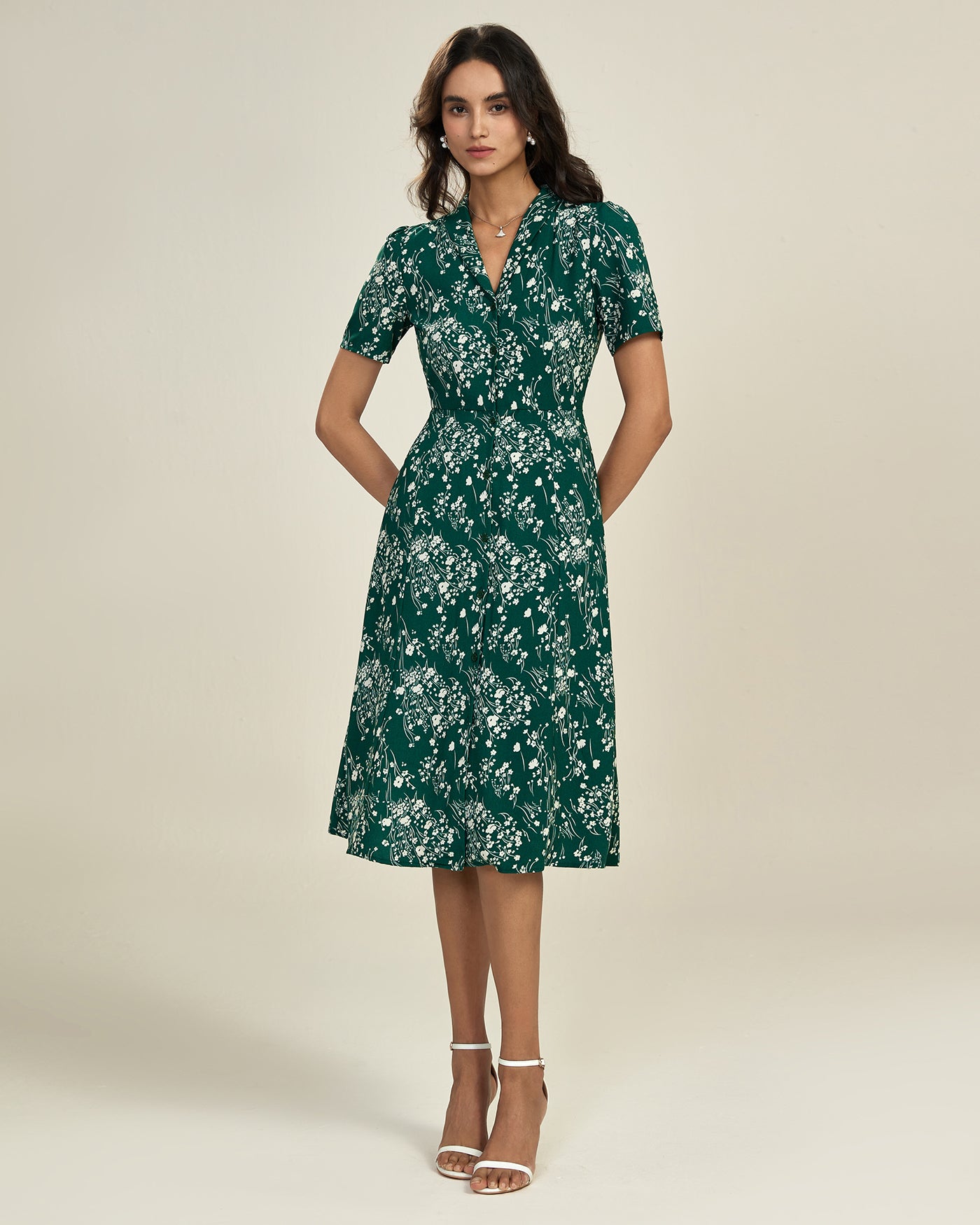 Green V Neck Floral Tunic Midi Dress