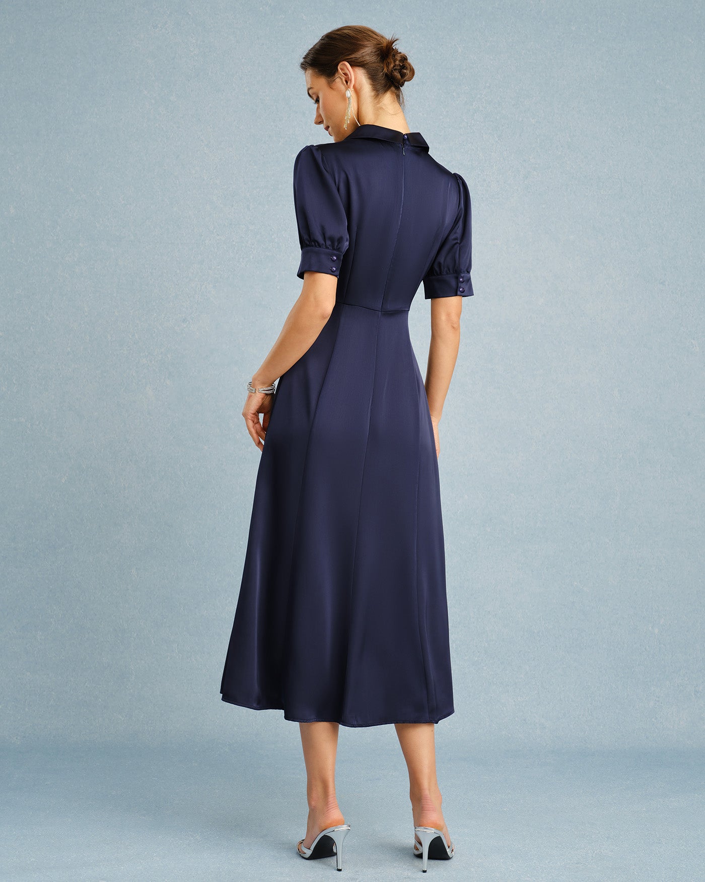 Navy Collar Puffed Sleeve Satin Midi Dress