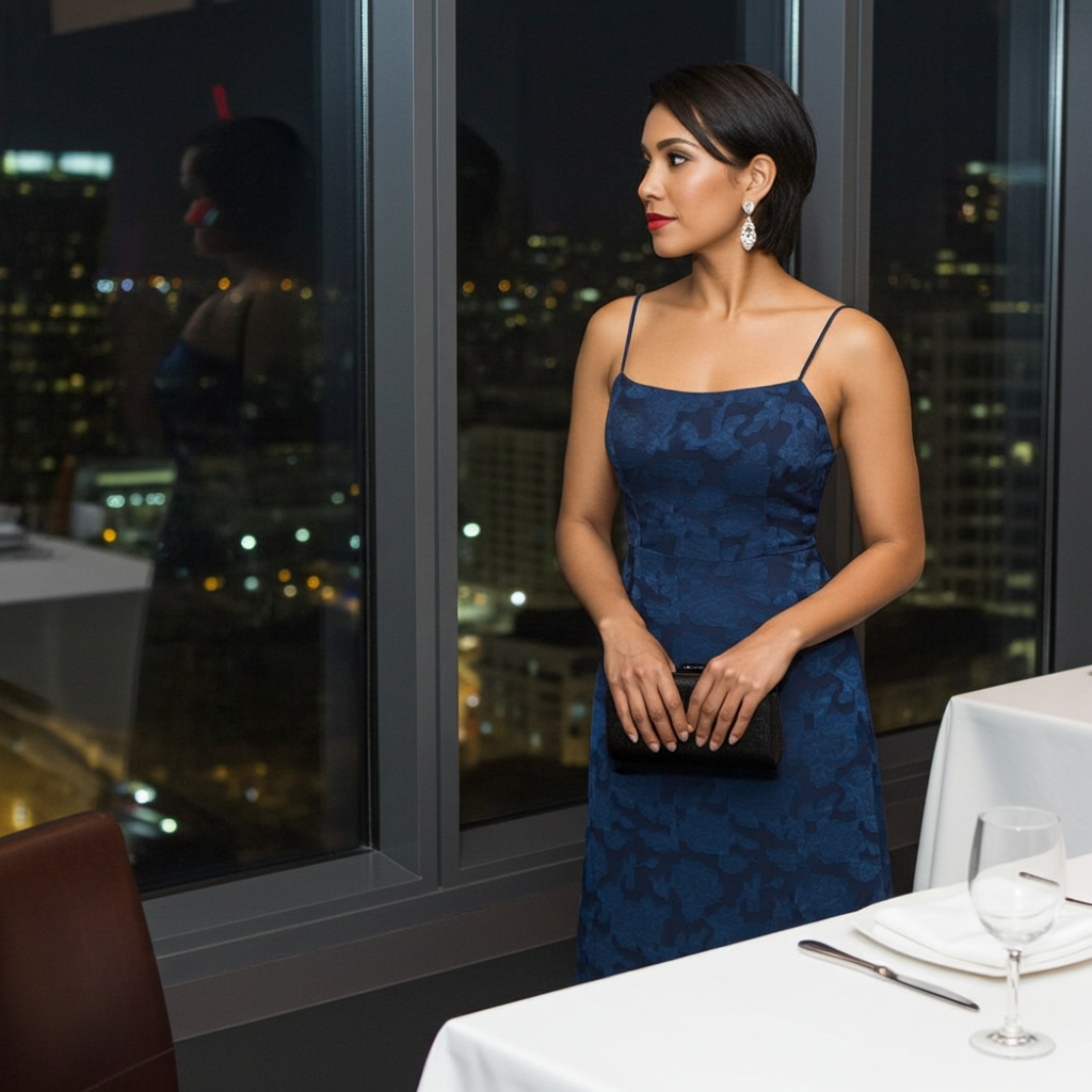 Marineblaues Jacquard-Maxikleid mit rückenfreiem Unterkleid