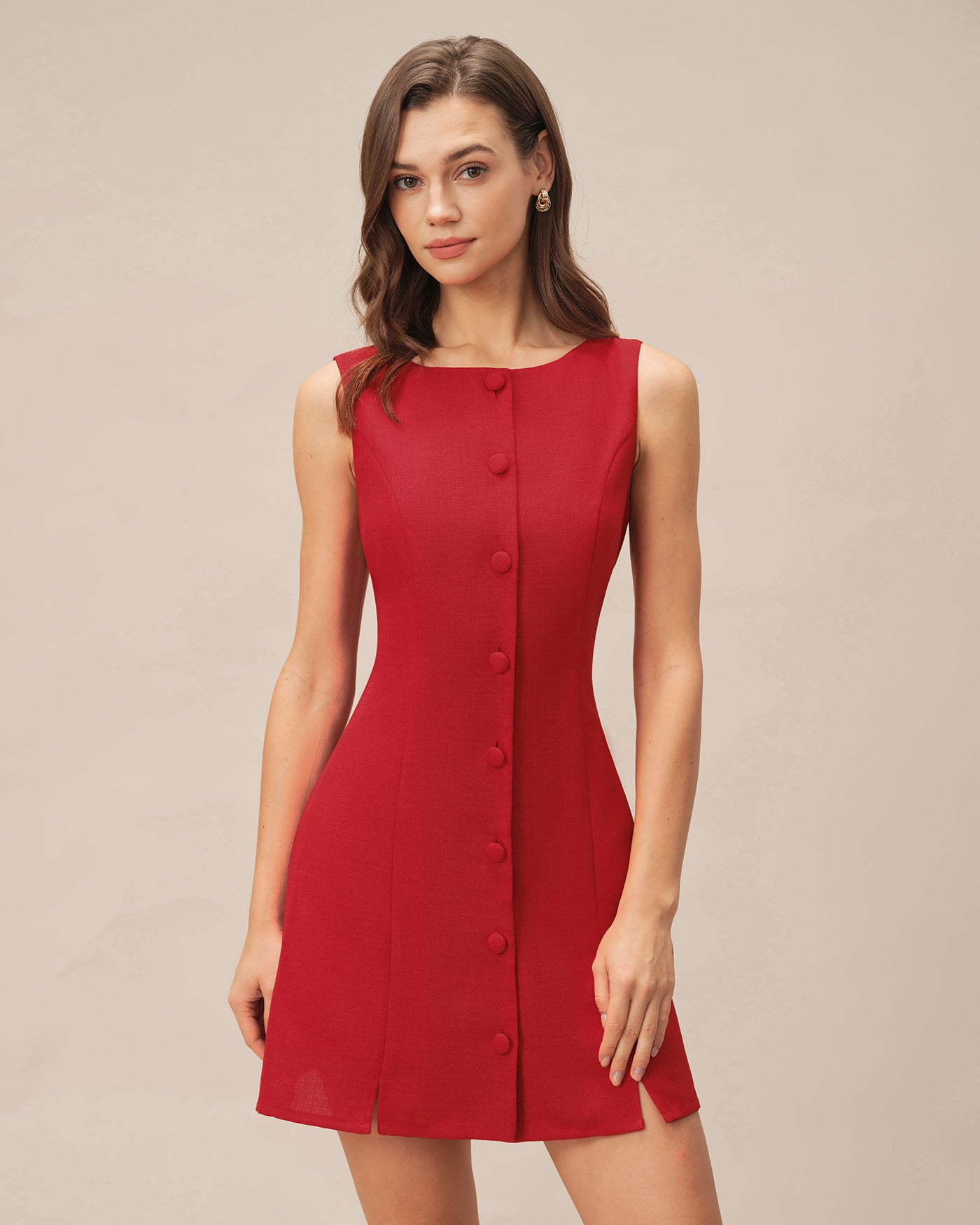 Red Boat Neck Button Mini Dress