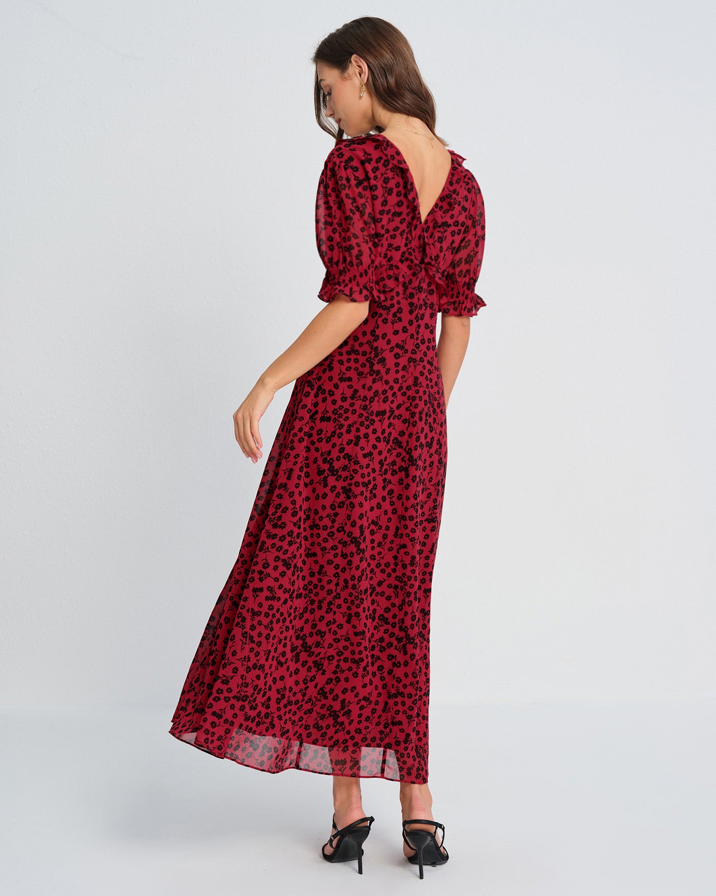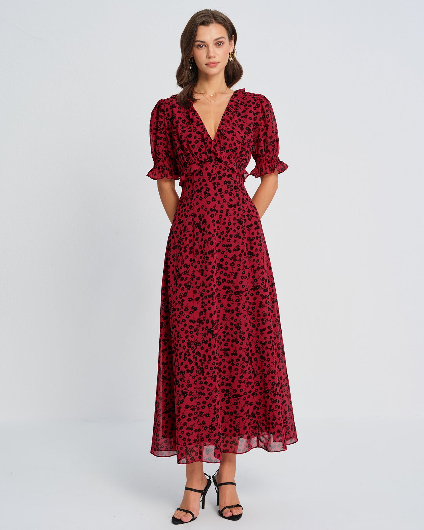 Red V Neck Floral Maxi Dress