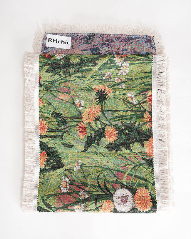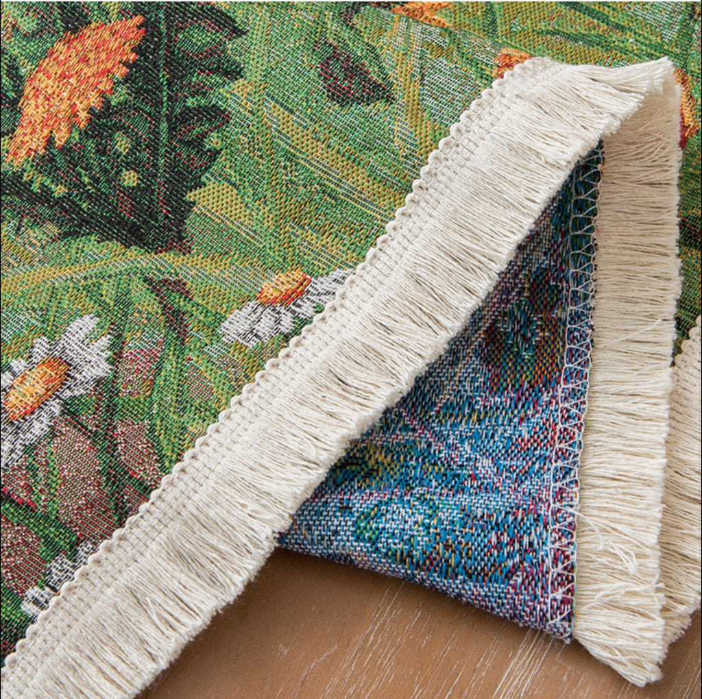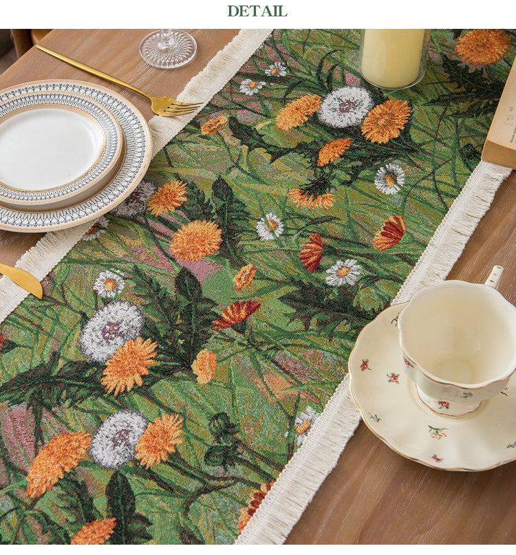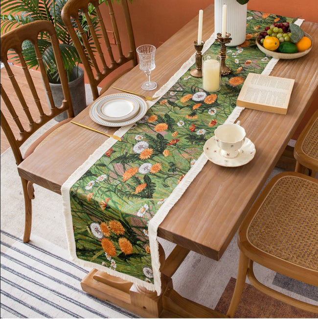 Bring a touch of nature to your dining space with this beautifully woven floral table runner. Featuring a vibrant meadow-inspired design with blooming dandelions and lush greenery, this piece adds warmth and charm to any table setting. The high-quality fabric is accented with soft fringe edging for an artisanal finish. Perfect for both everyday use and special occasions.