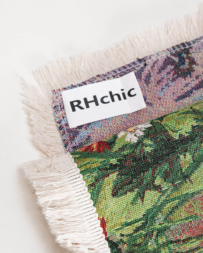 Material: Woven fabric with textured detail and fringe edges