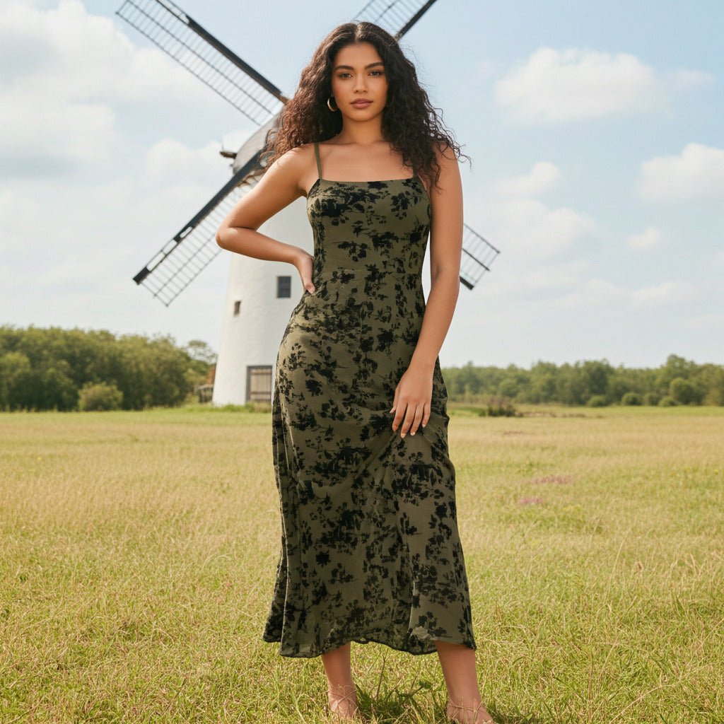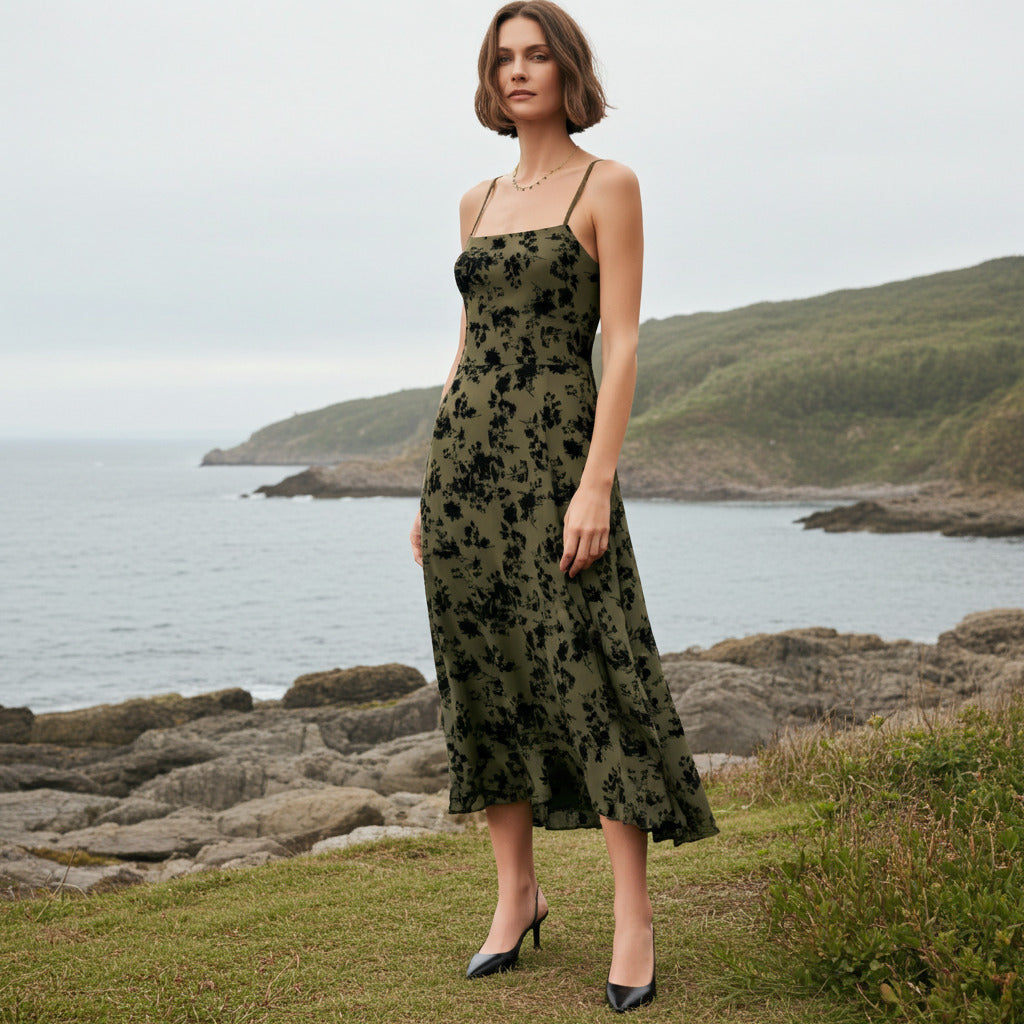 Das grüne, geblümte Burnout-A-Linien-Slip-Midikleid