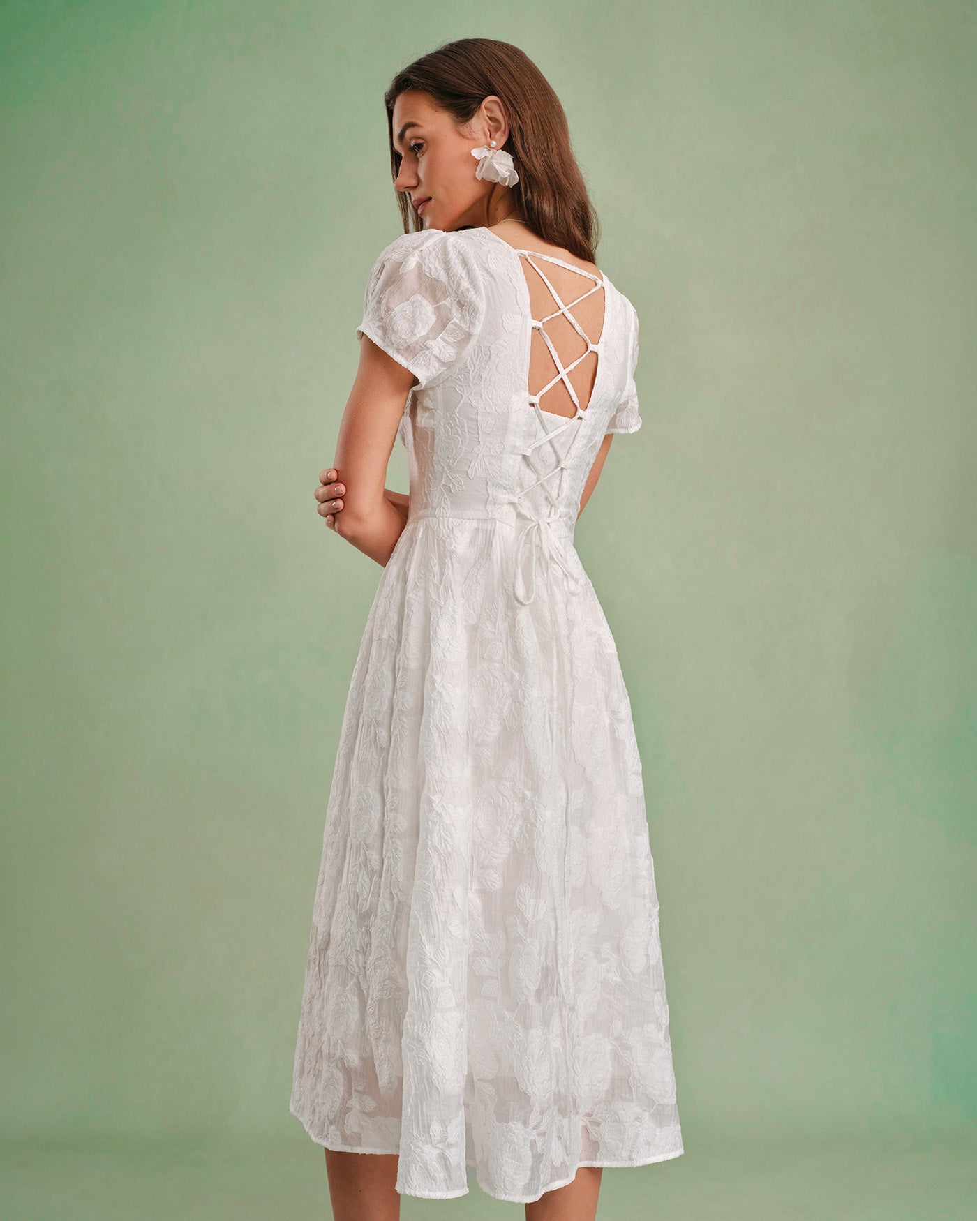 Description: Step into timeless romance with our White Textured Floral Midi Dress. Designed for elegant daily wear or special spring events, this dress features a beautiful, raised botanical floral texture woven into crisp white fabric. The tailored bodice is framed by a flattering square neckline and delicate short sleeves, complete with a classic button-front detail that adds a touch of vintage charm.