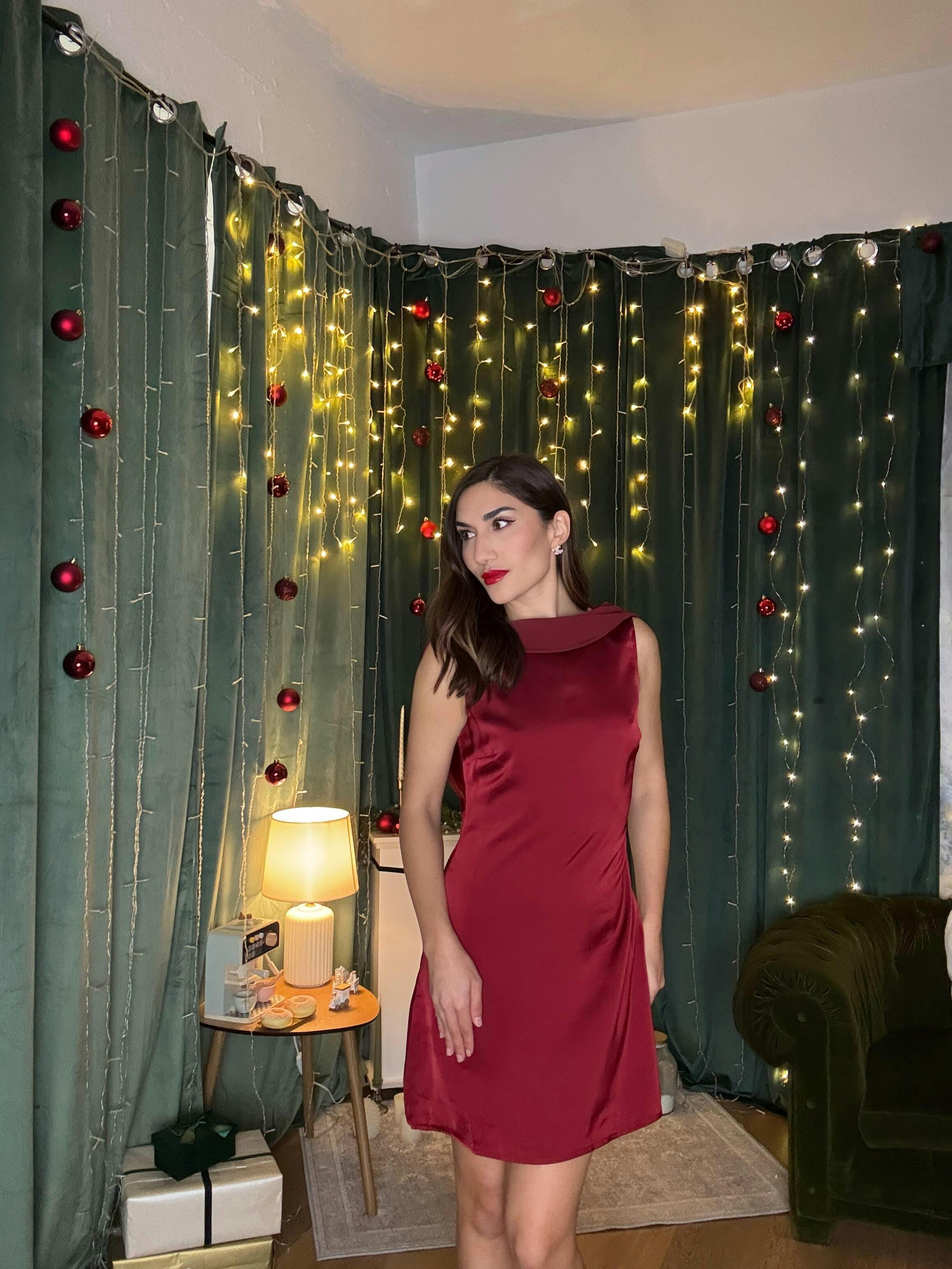 Weinrotes Satin-Minikleid mit Wasserfallausschnitt und offenem Rücken