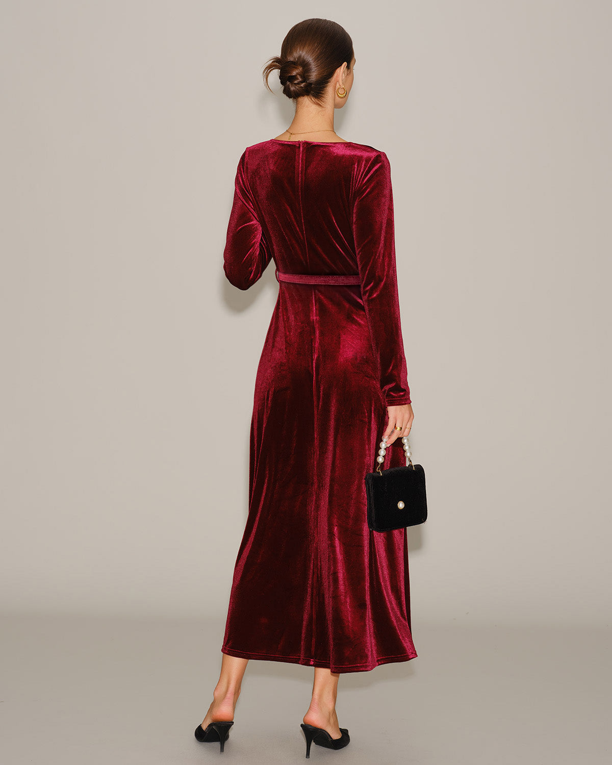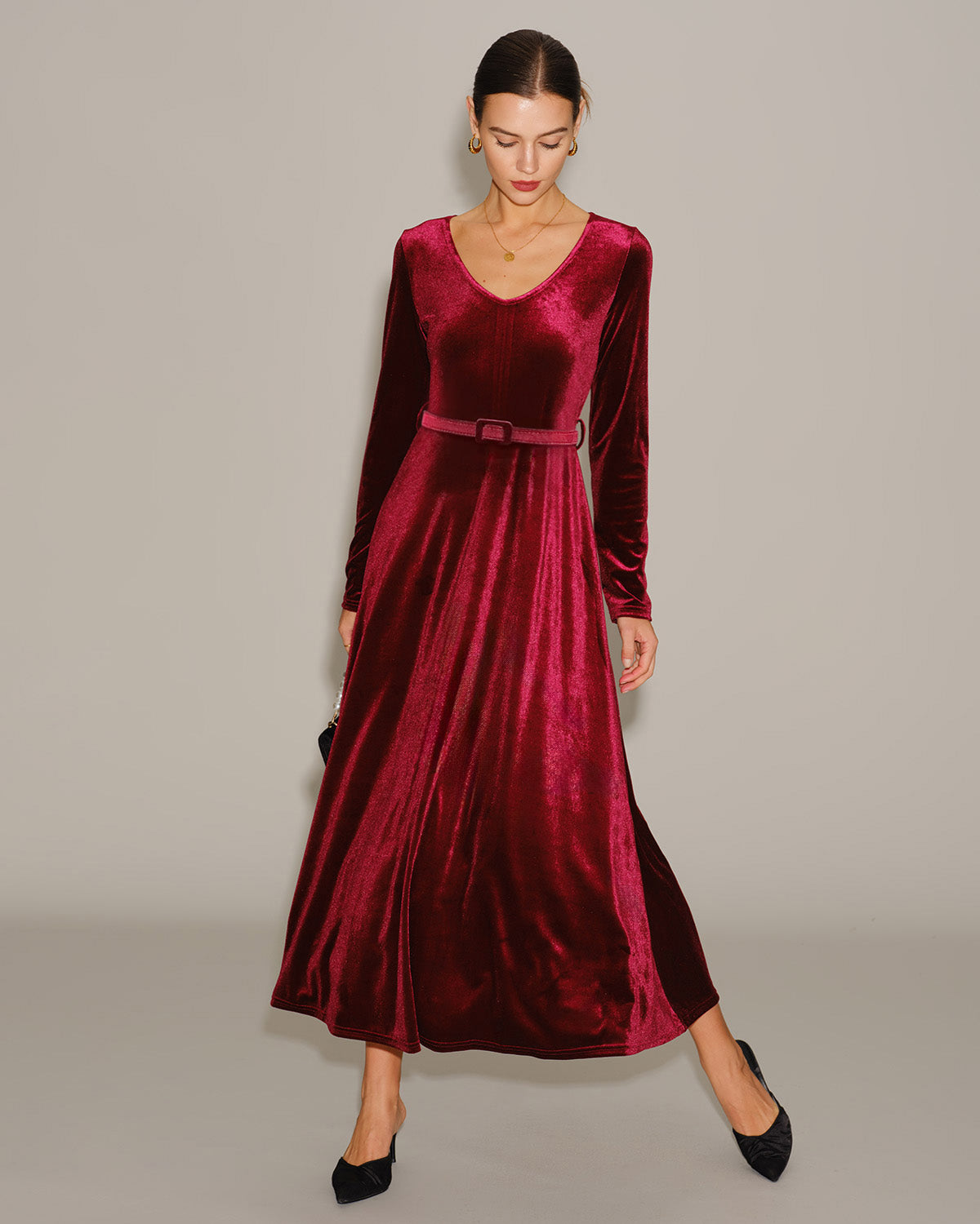 Wine Red Velour V Neck Maxi Dress