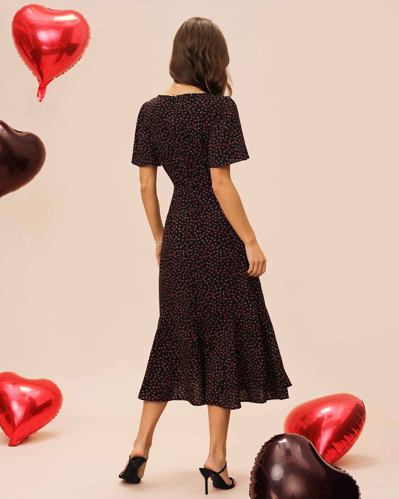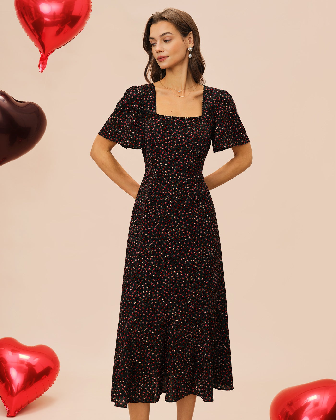 Black Square Neck Butterfly Sleeve Floral Midi Dress