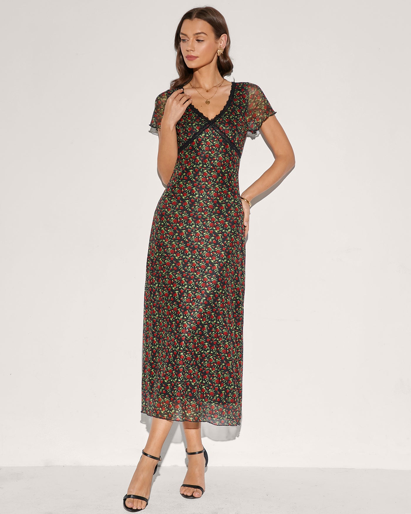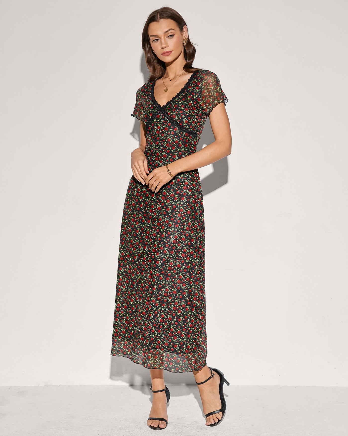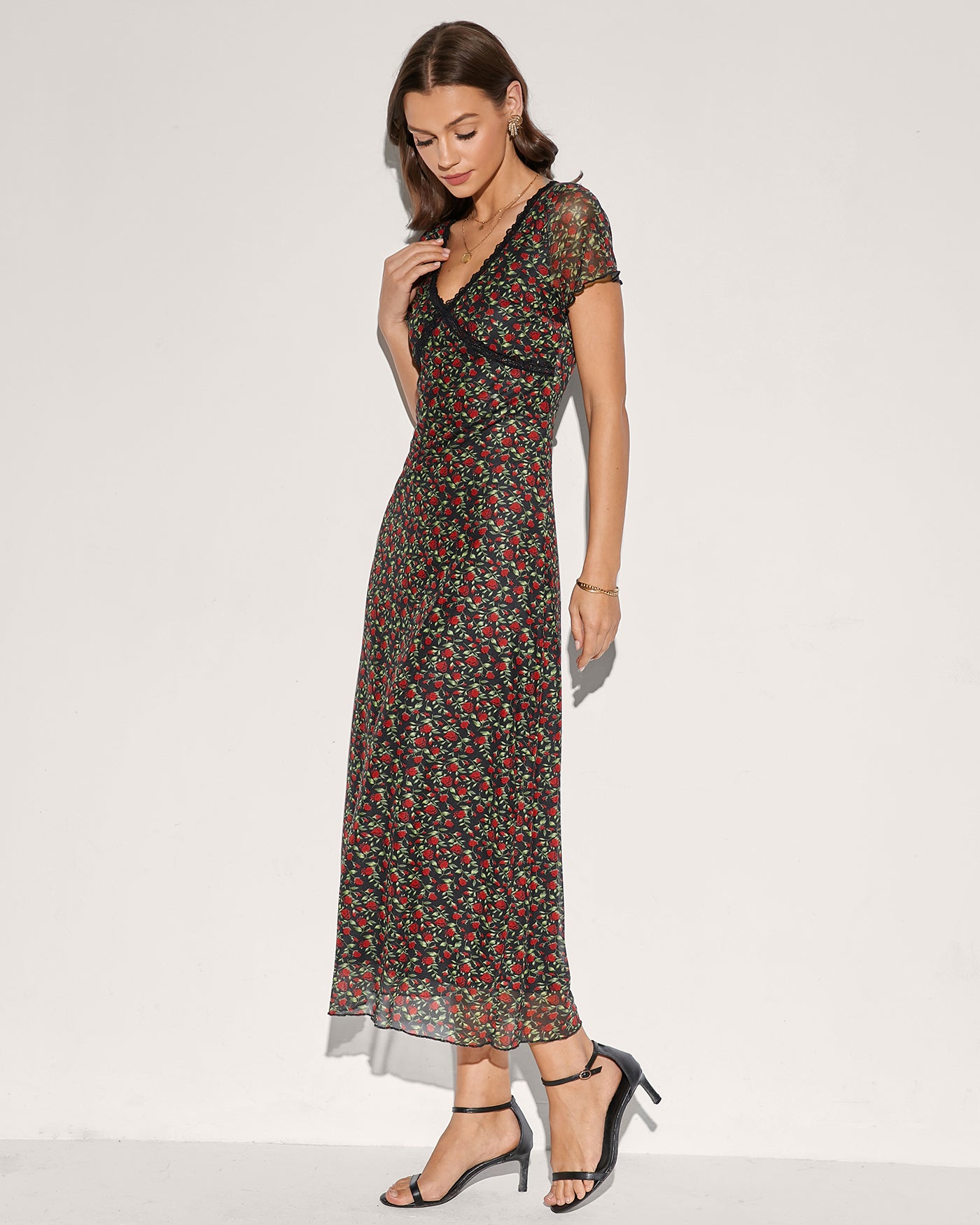Black V Neck Floral Lace Midi Dress