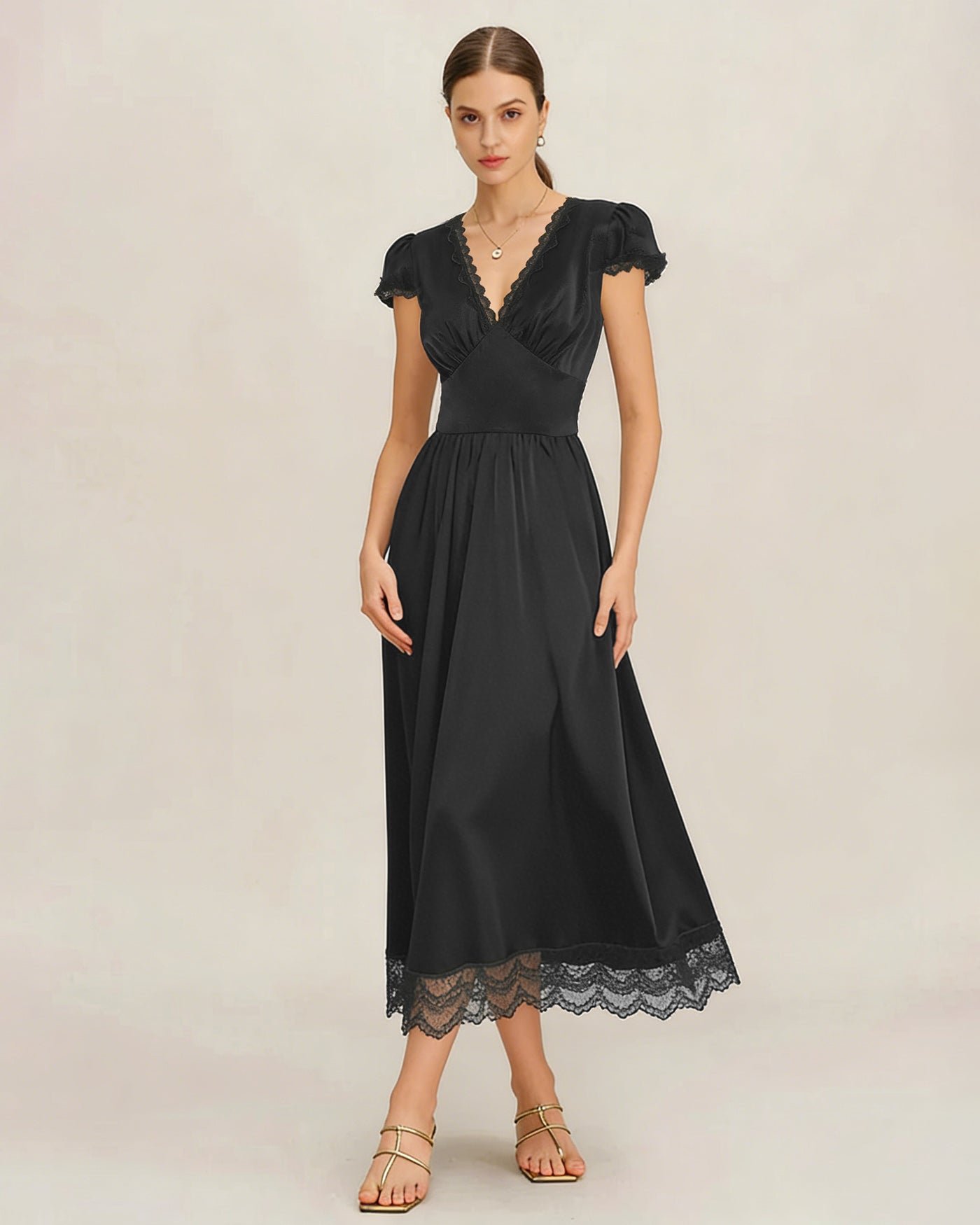Black V Neck Lace Puffed Sleeve Maxi Dress