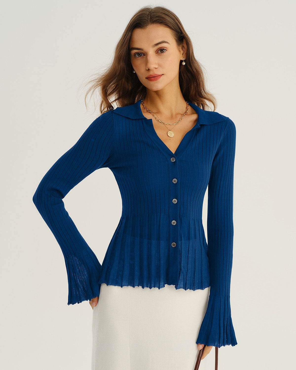 Blue V-Neck Bell Sleeve Knit Cardigan