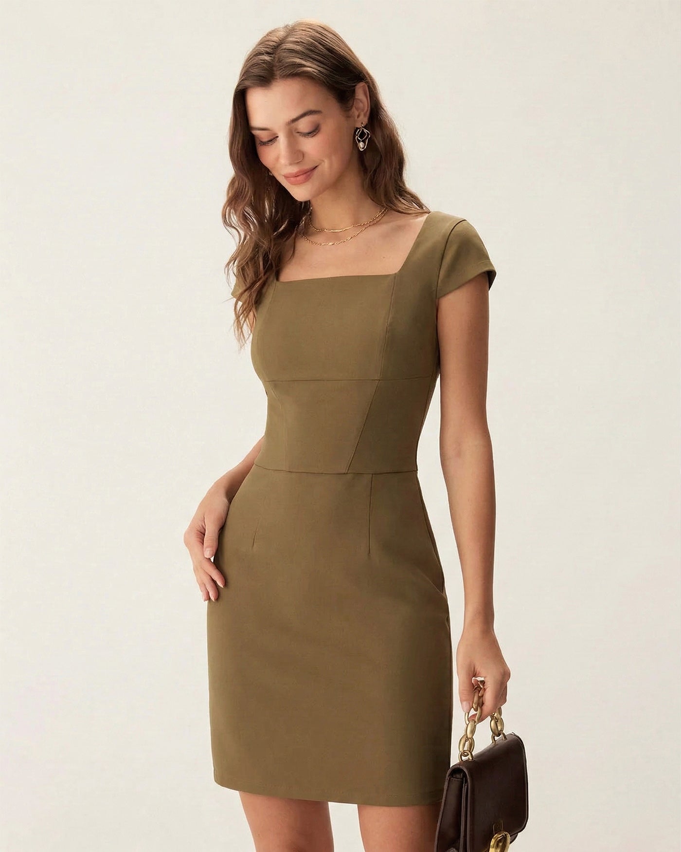 Meet your new olive square neck cap sleeve sheath dress for work. Clean lines, a natural waist and subtle darting create a streamlined, office-ready silhouette that looks pulled together with zero effort. The woven poly-viscose fabric feels smooth and structured with just enough spandex to keep you comfortable through meetings, commutes and after-work plans. A square neckline frames your collarbones, while cap sleeves keep things polished but cool. Soft ruching at the waist and a back slit add a touch of femininity and make walking easy. Pair this versatile neutral with pumps and a blazer for presentation days, then swap in gold hoops and strappy heels for dinner.