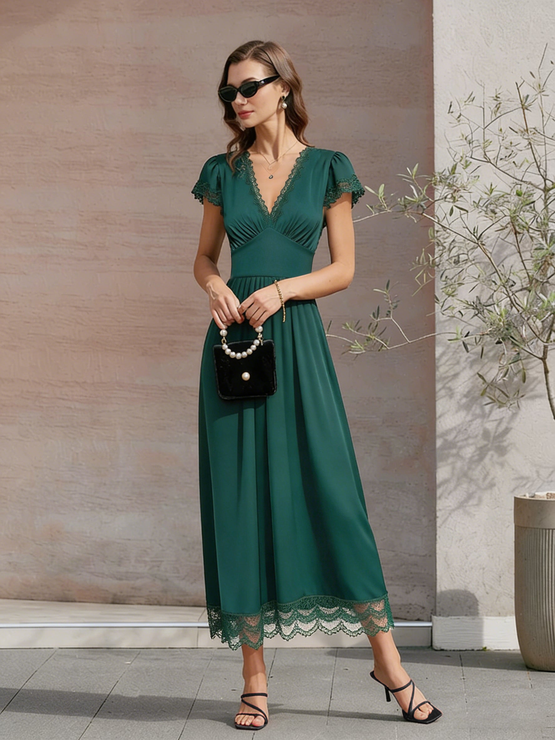 Green V Neck Lace Maxi Dress