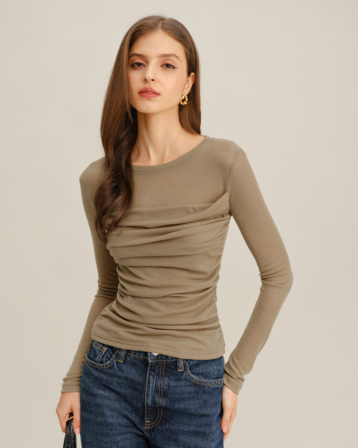 Khaki Knit Round Neck Ruched Tee