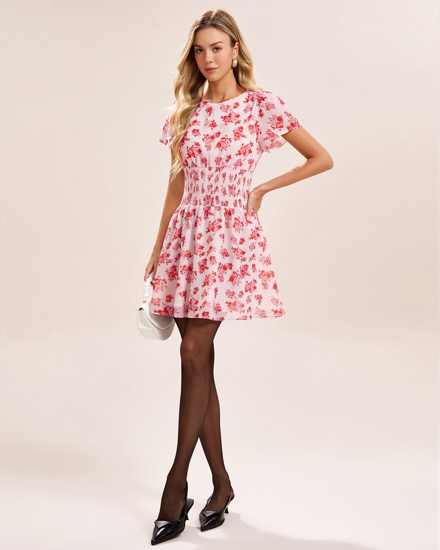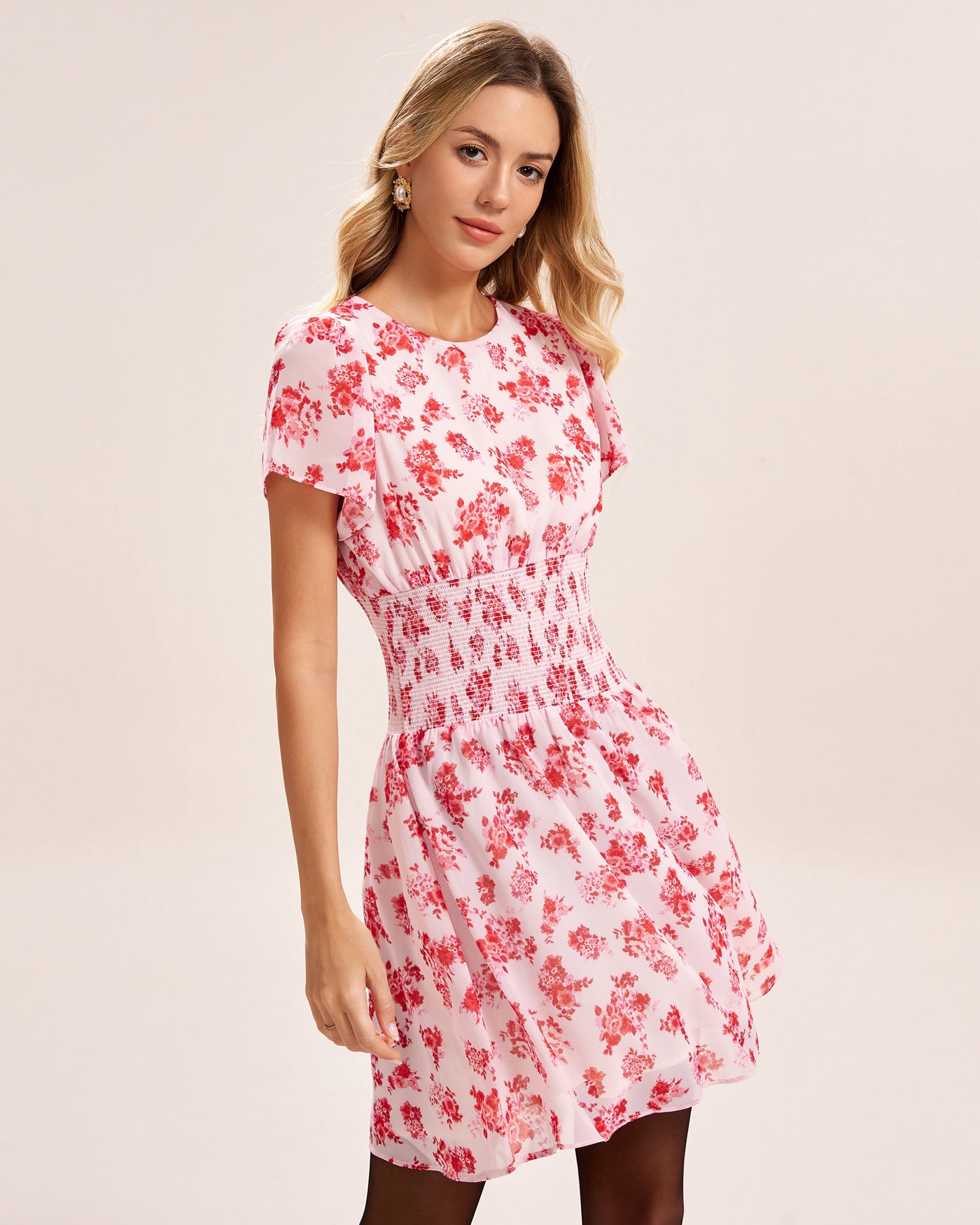 Pink Floral Shirred Mini Dress