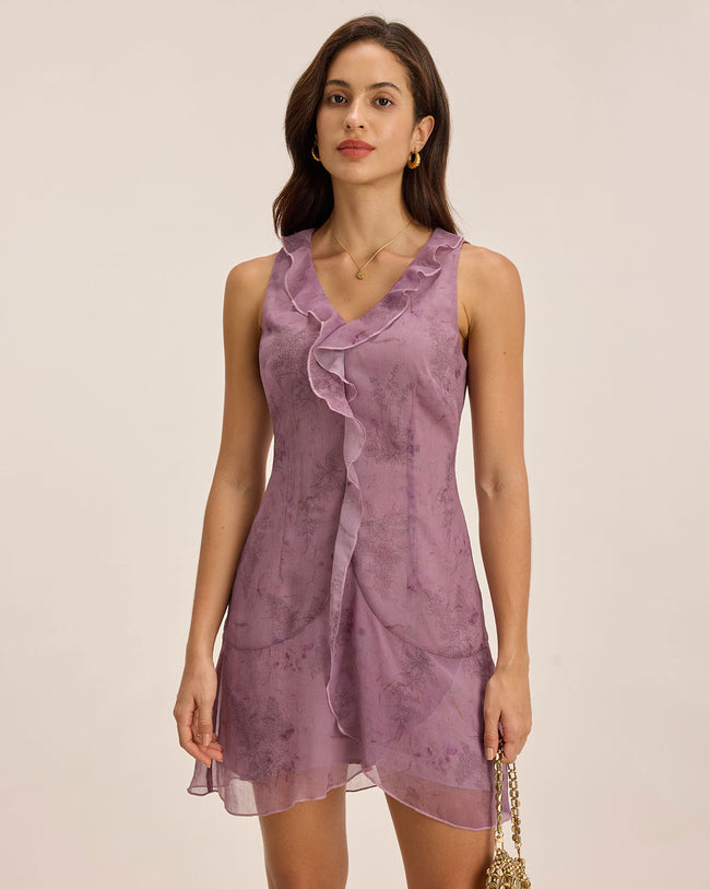 Purple Floral V Neck Ruffle Sleeveless Mini Dress