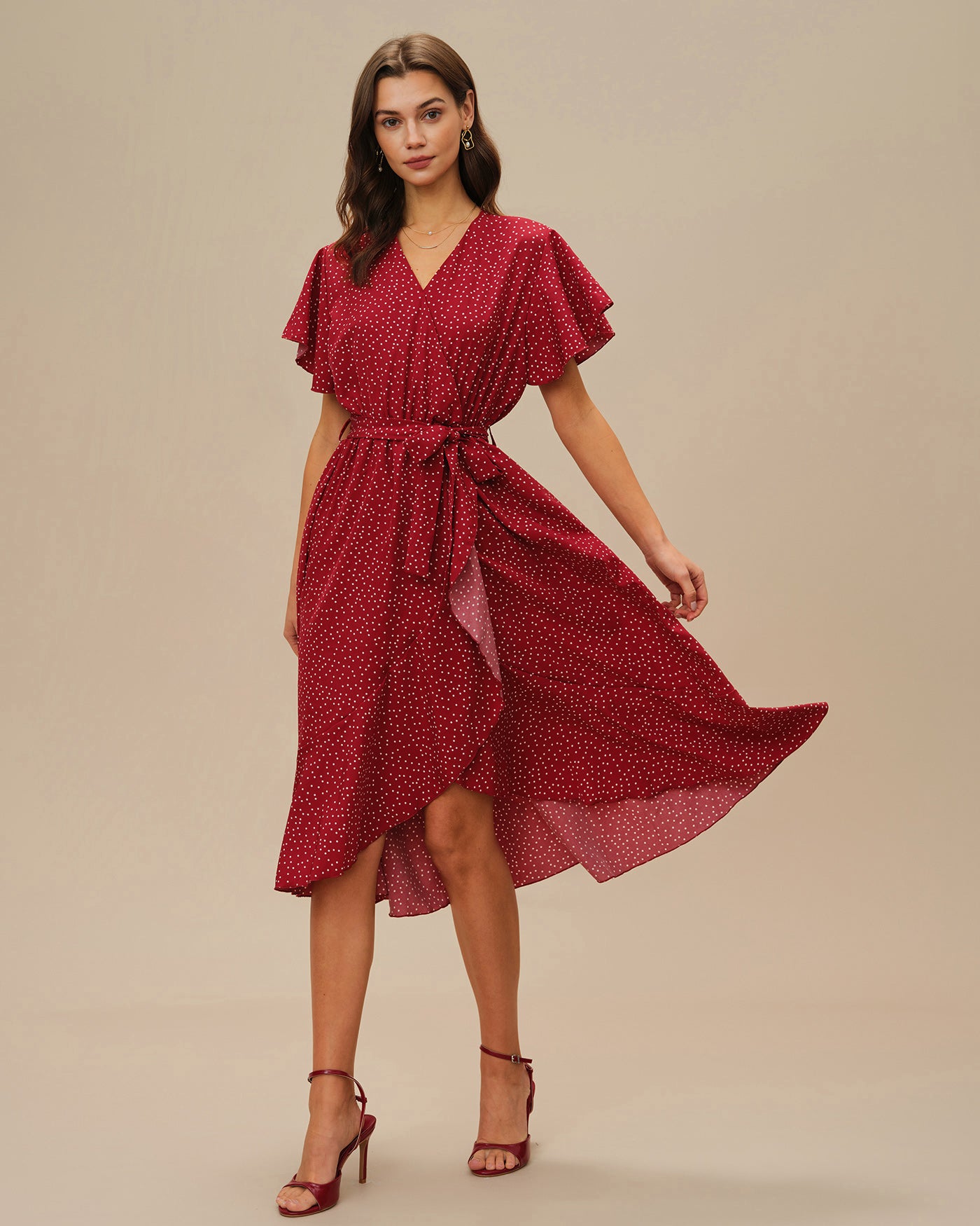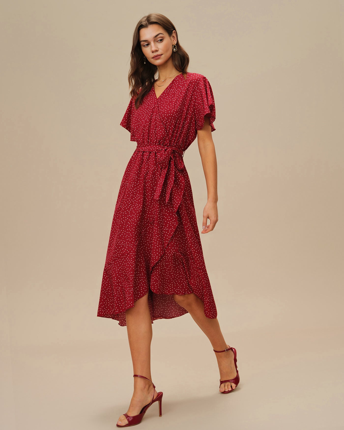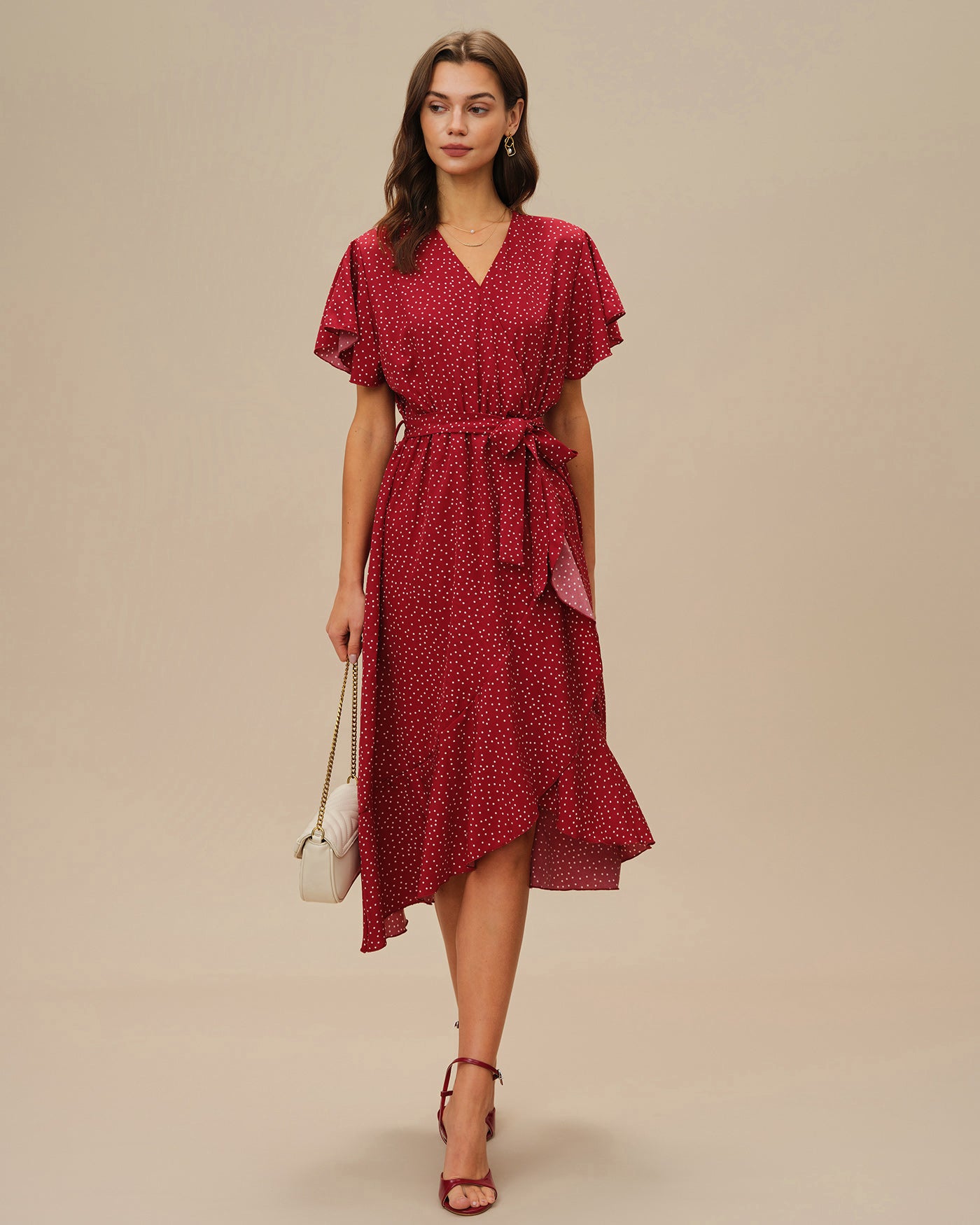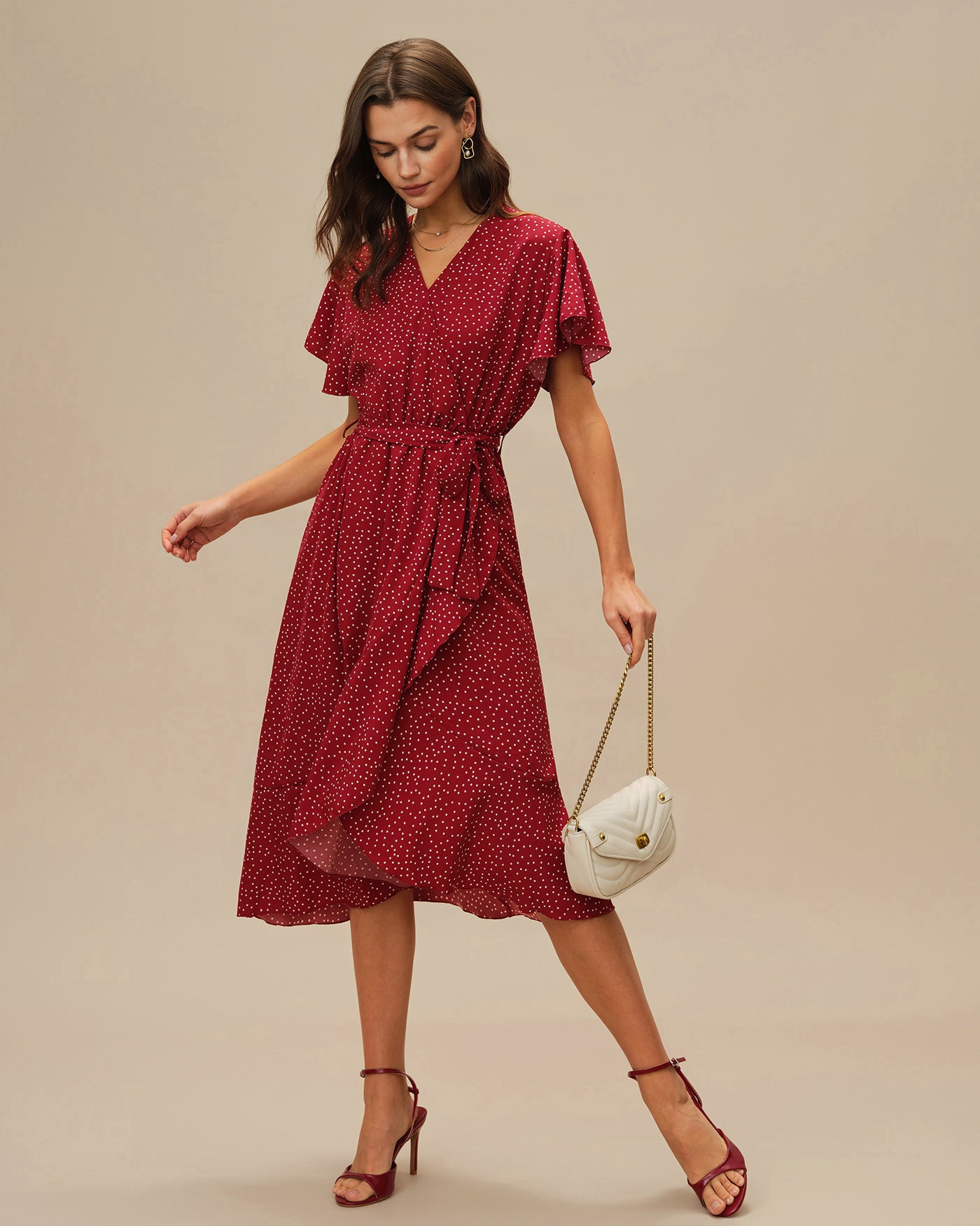 Red Butterfly Sleeve Polka Dot Midi Dress
