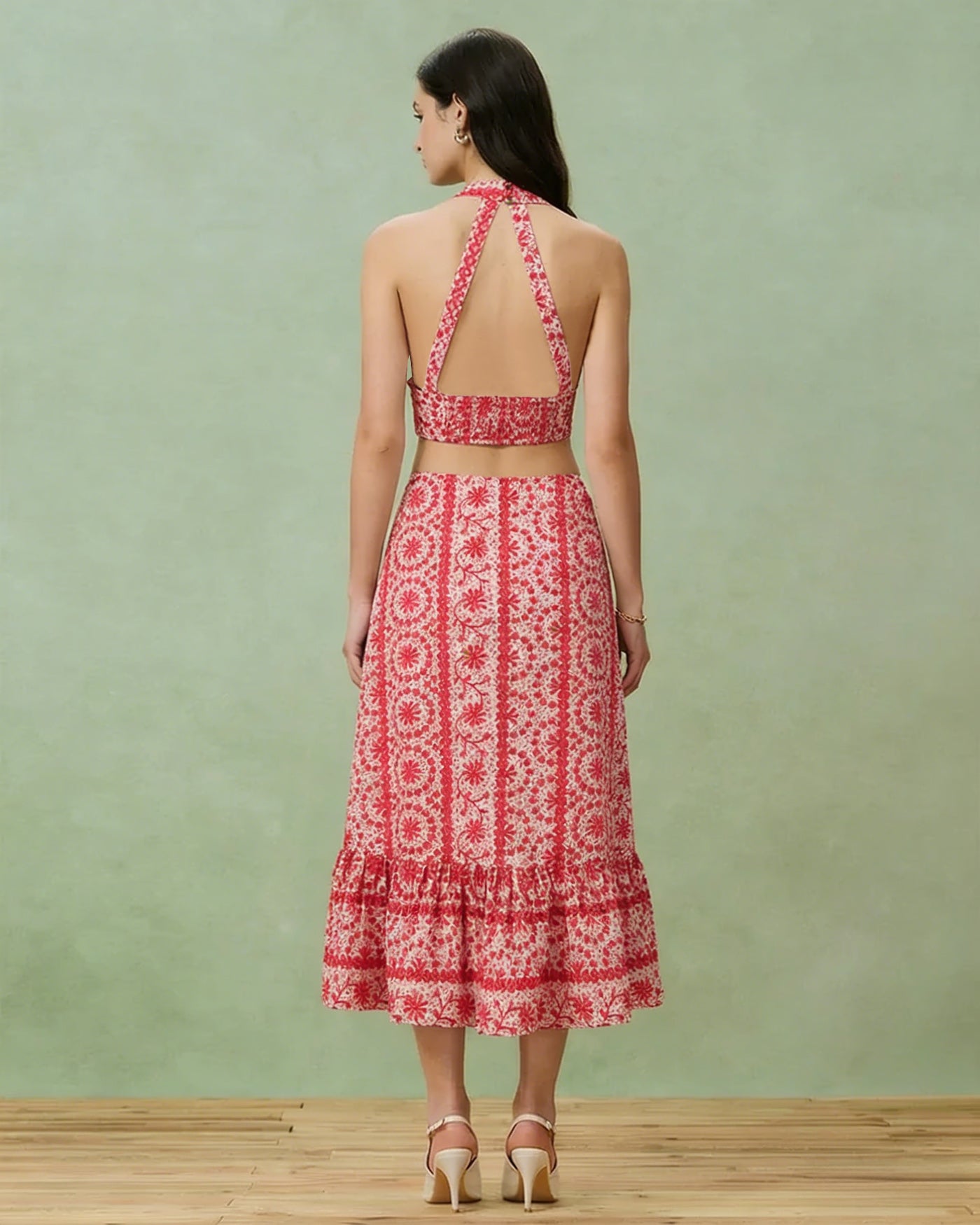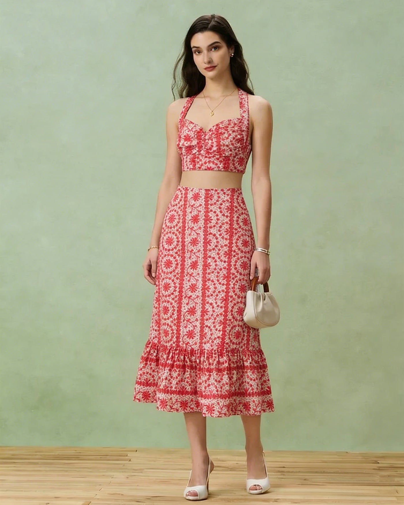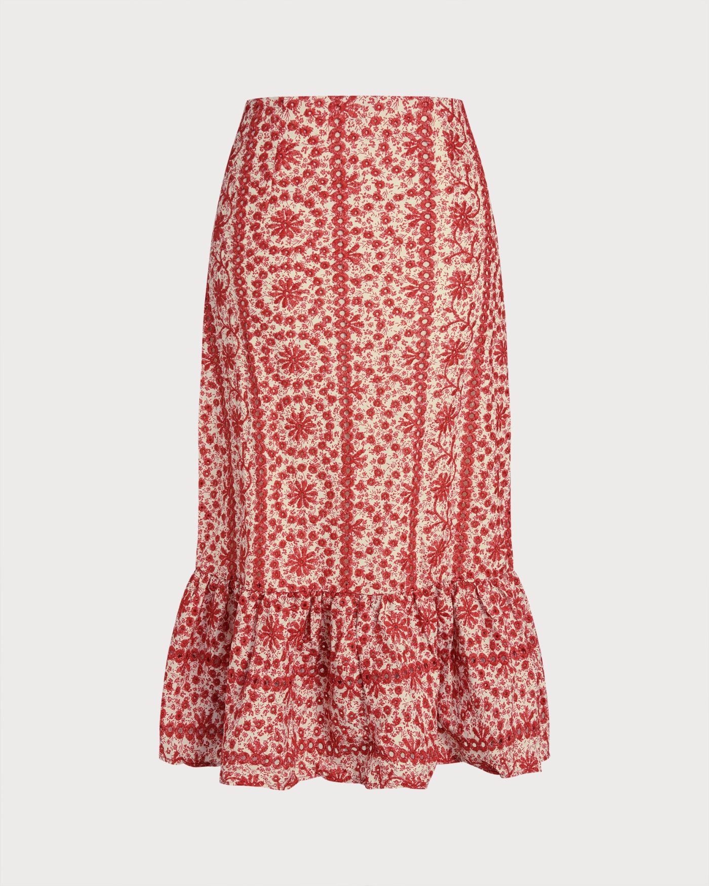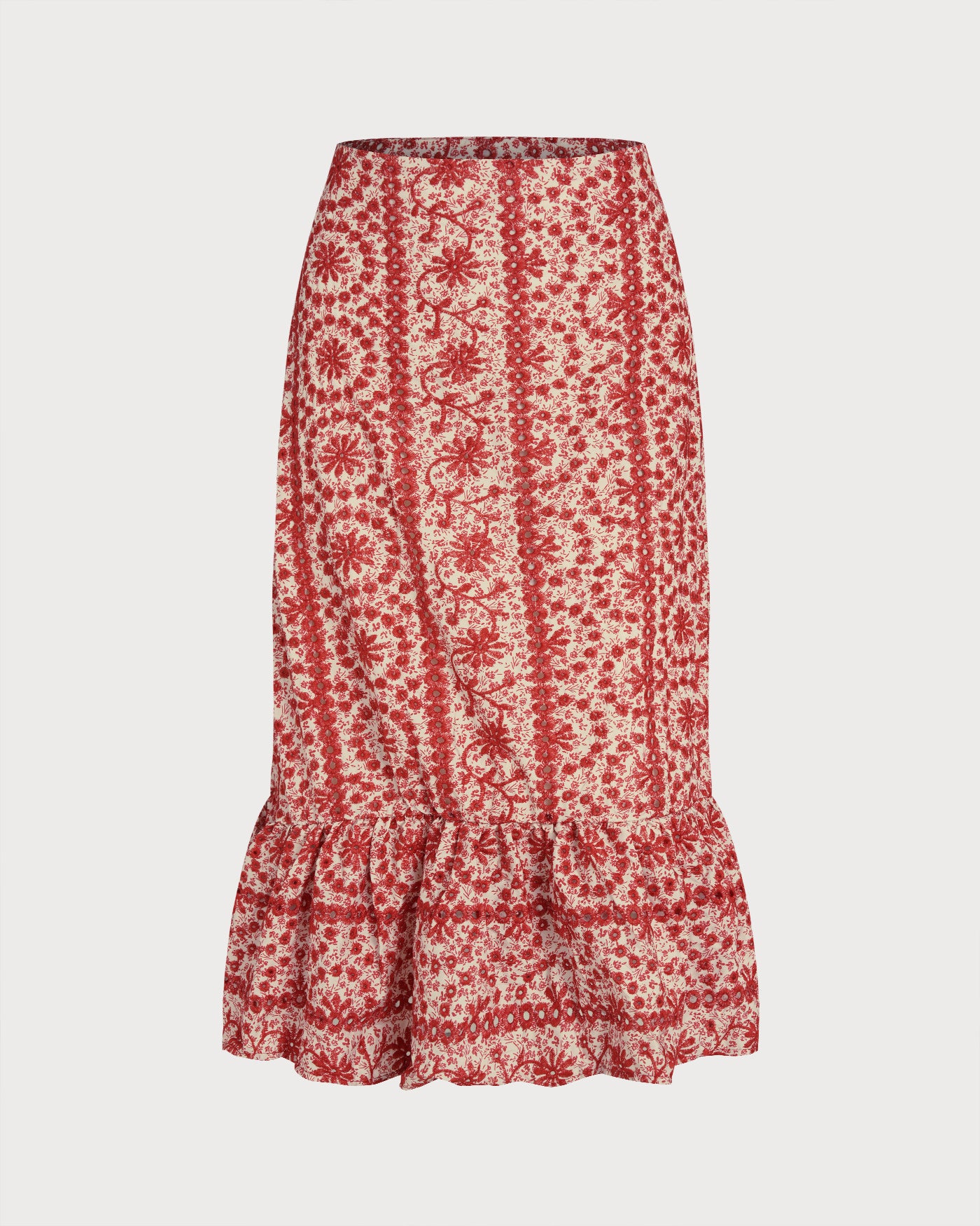 Red Floral Ruched Midi Skirt