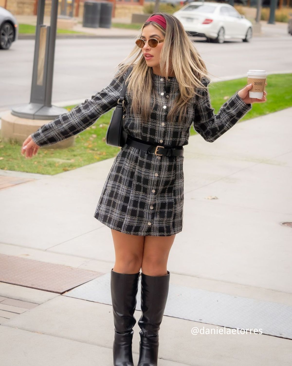 This Button Mini Dress is a stunning and elegant dress that is perfect for any occasion. The crew neck and A-Line deisgn adds a touch of sophistication to the dress, while the button and plaid deisgn add a unique and eye-catching element. The long sleeves and slim fit make it comfortable and easy to wear, while also creating a flattering silhouette that accentuates the figure.