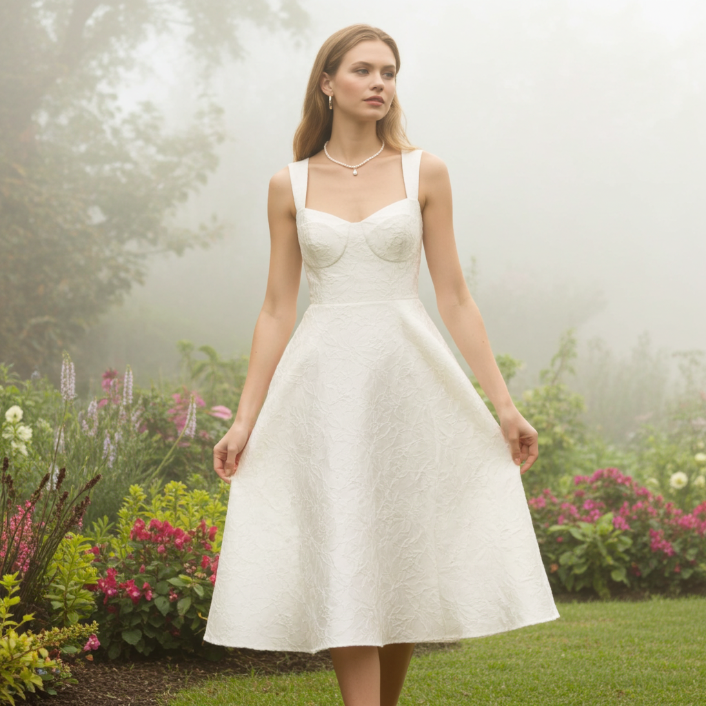 Crafted from luxurious jacquard fabric, this white dress boasts a subtle texture and a refined sheen that elevates its overall look. The pristine white hue offers a versatile canvas that can be styled for a variety of occasions, from formal events to cocktail parties.