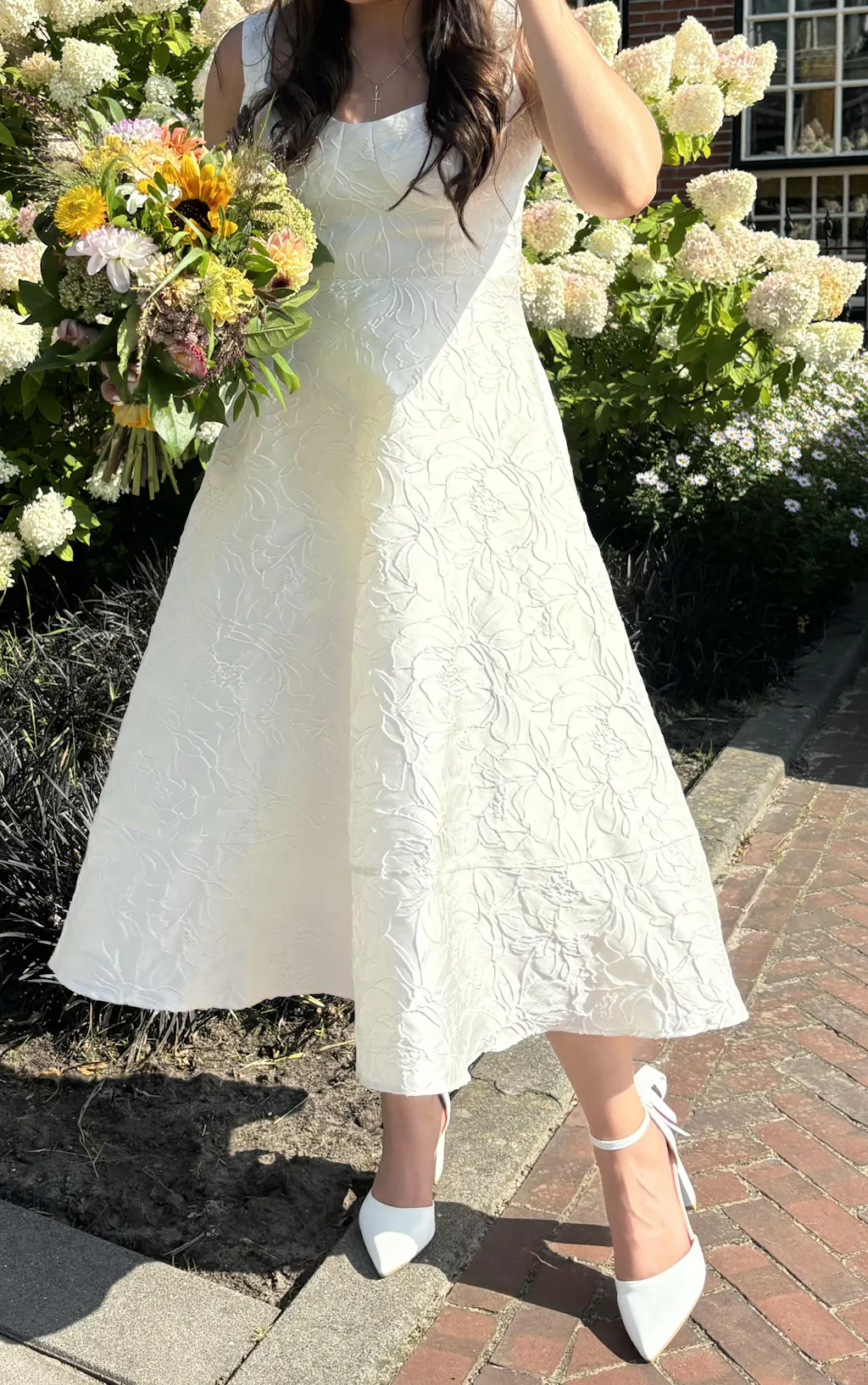 Crafted from luxurious jacquard fabric, this white dress boasts a subtle texture and a refined sheen that elevates its overall look. The pristine white hue offers a versatile canvas that can be styled for a variety of occasions, from formal events to cocktail parties.