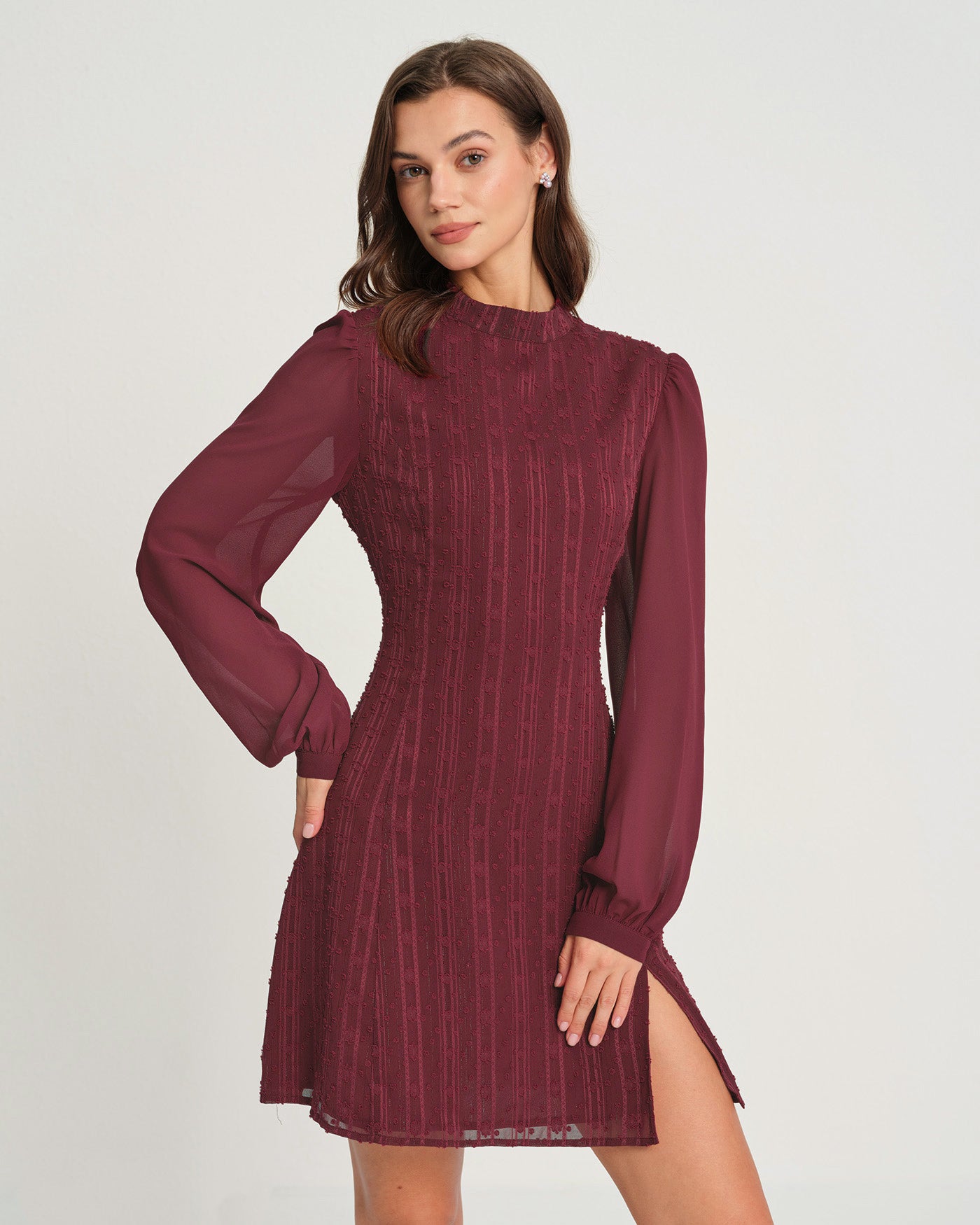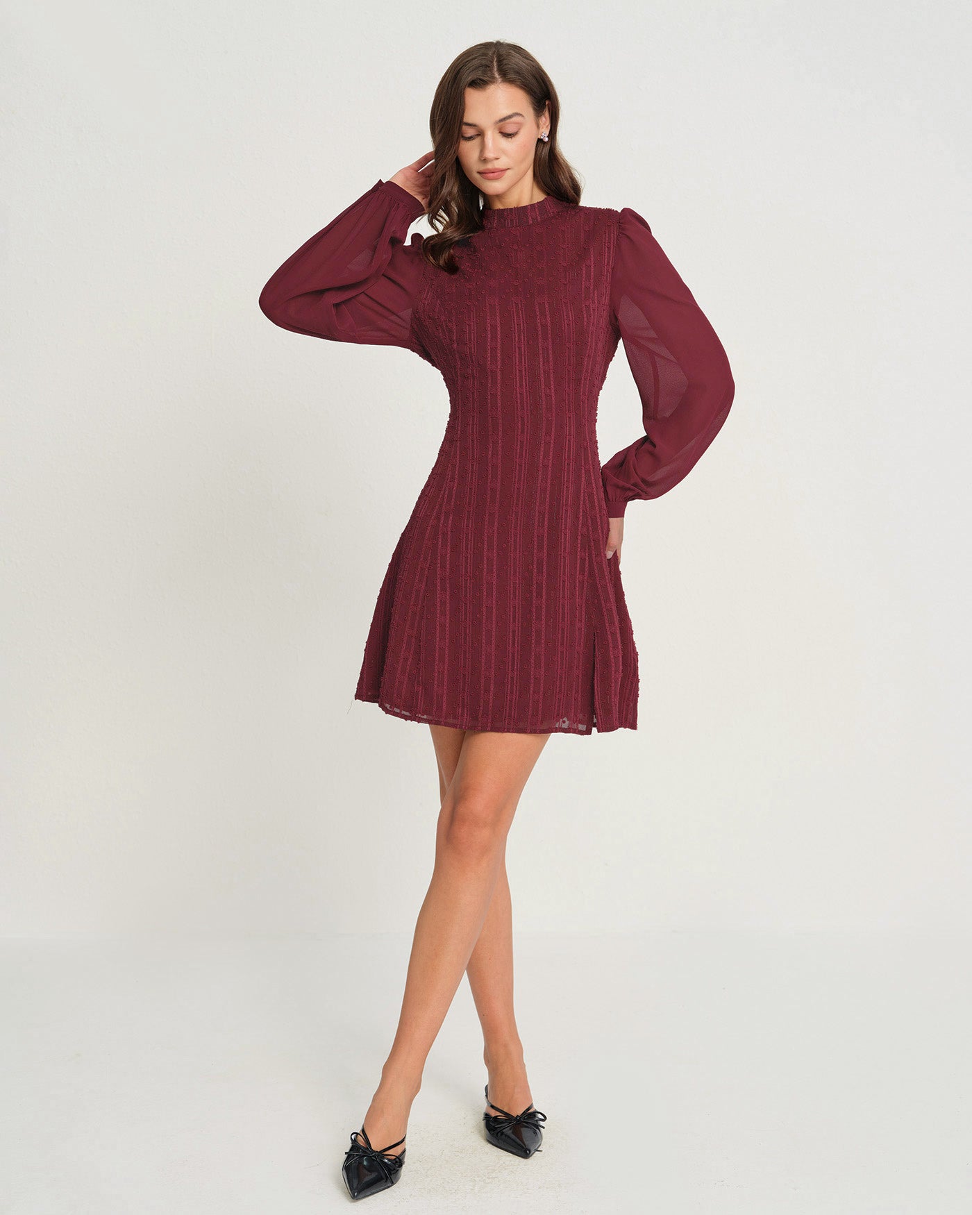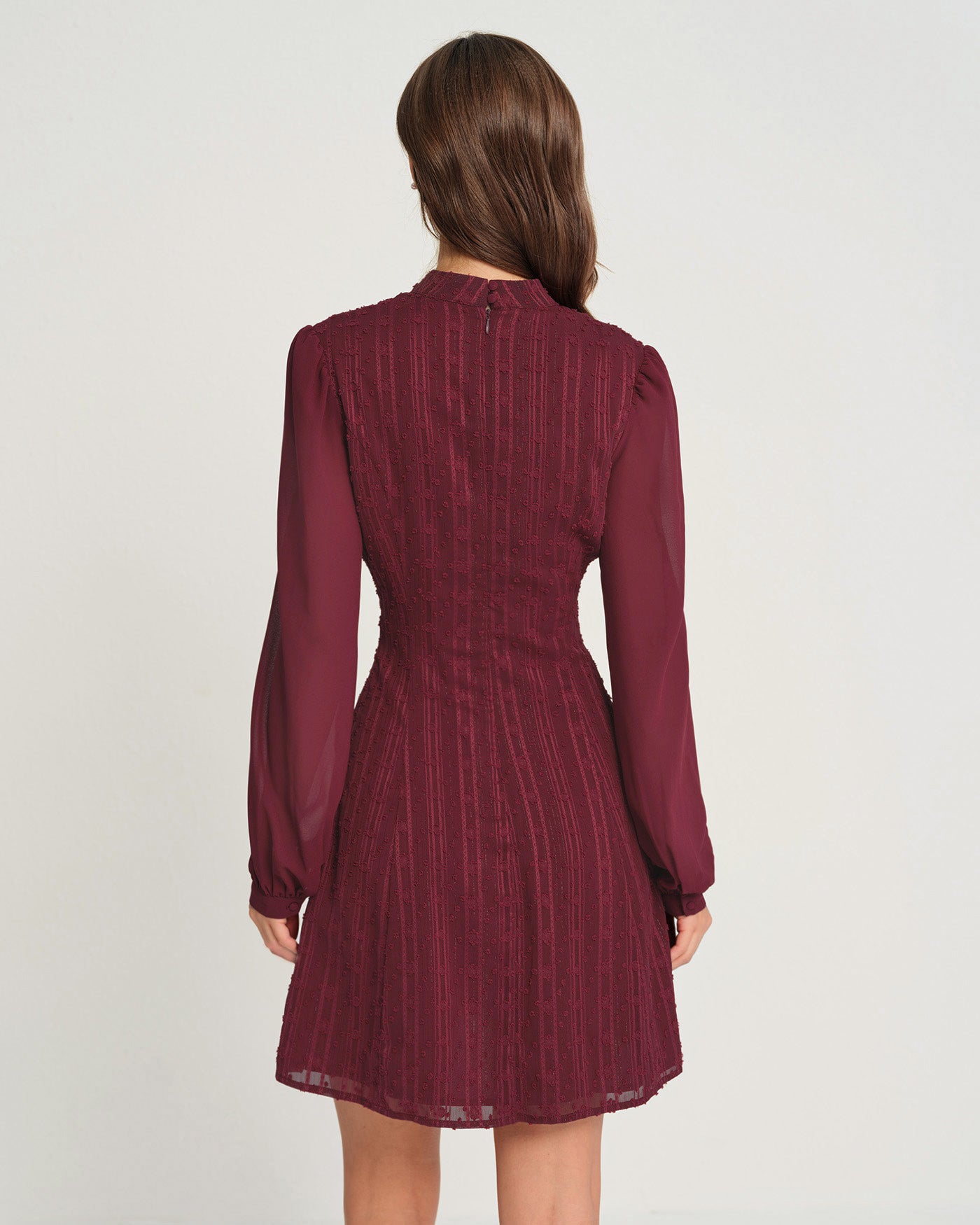 Wine Red Chiffon Mock Neck Mini Dress