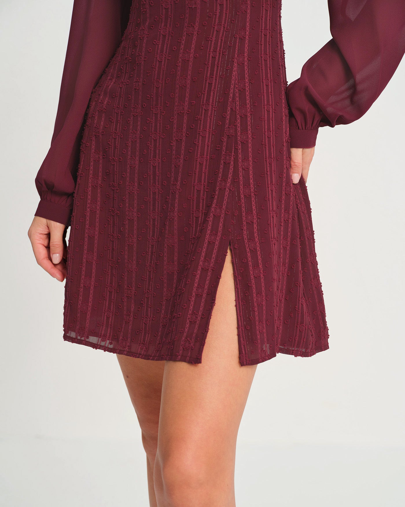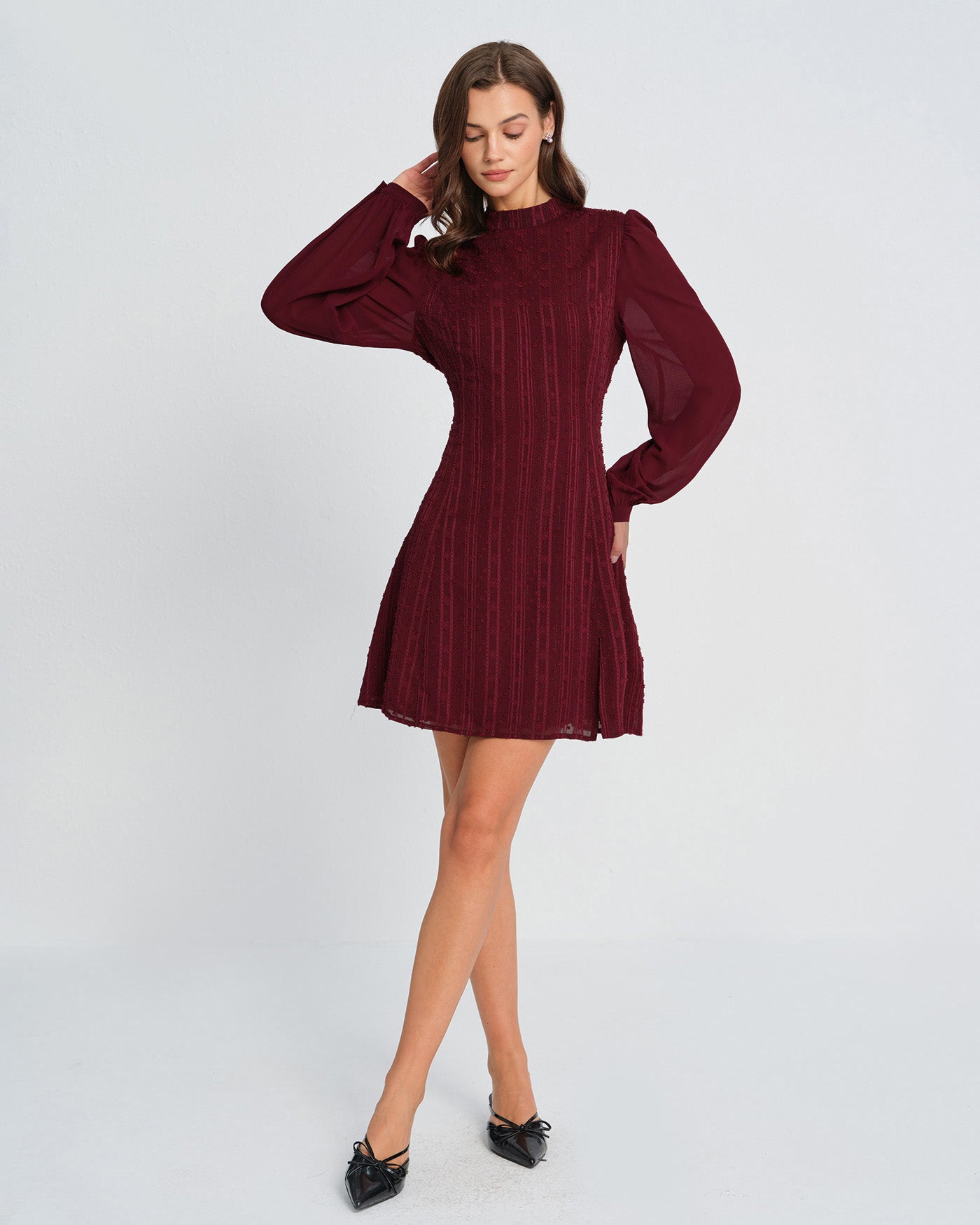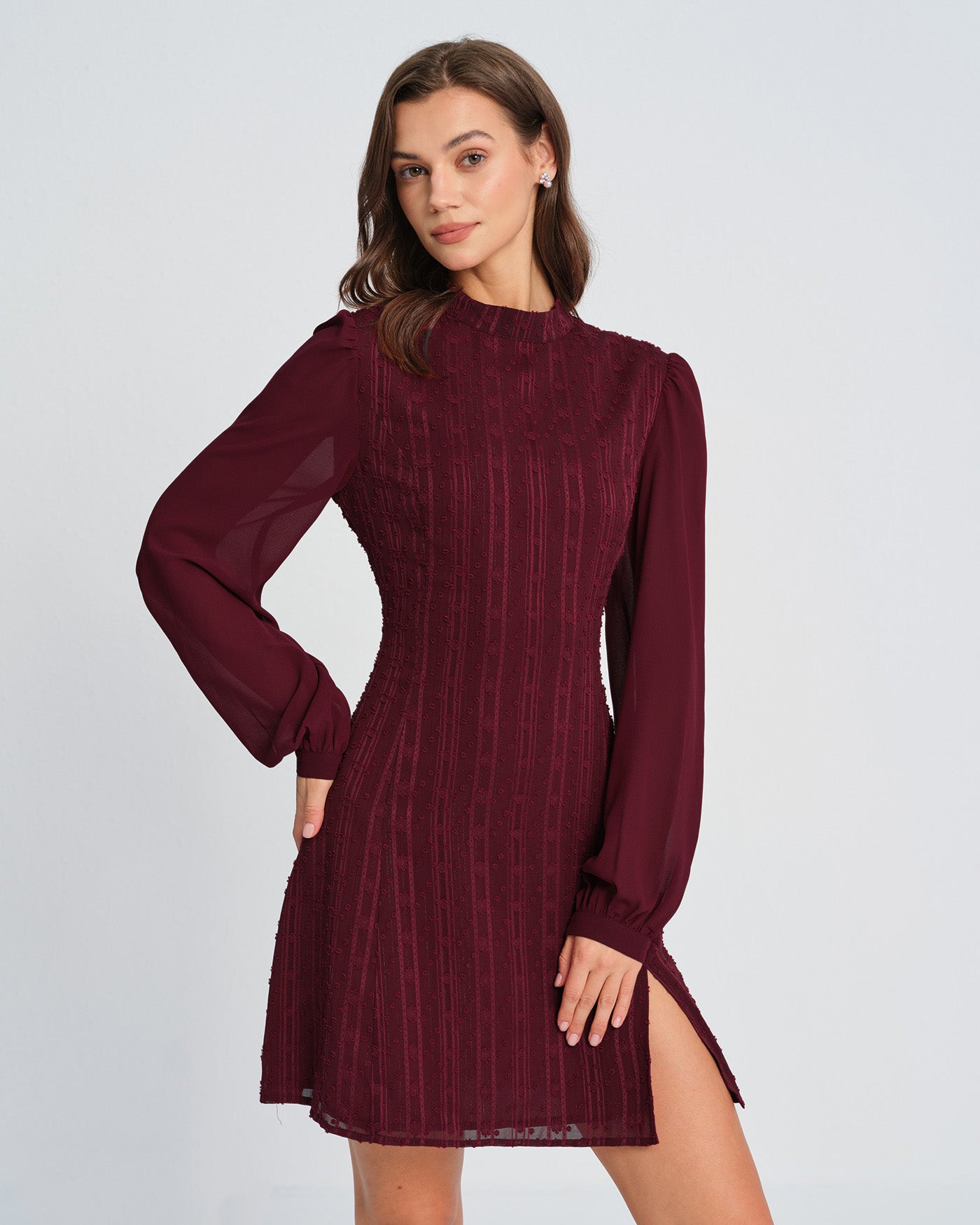 Wine Red Chiffon Mock Neck Mini Dress