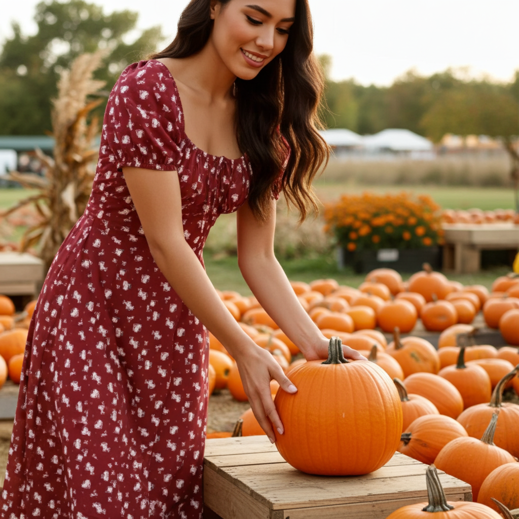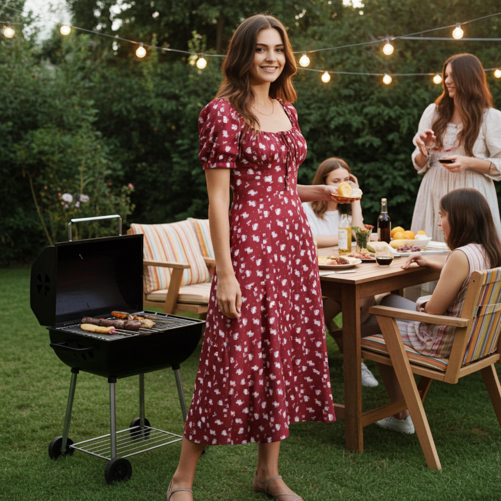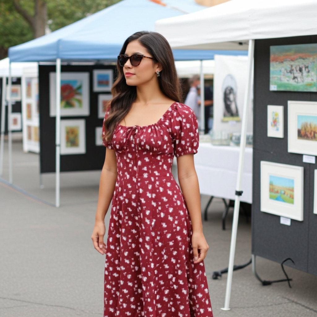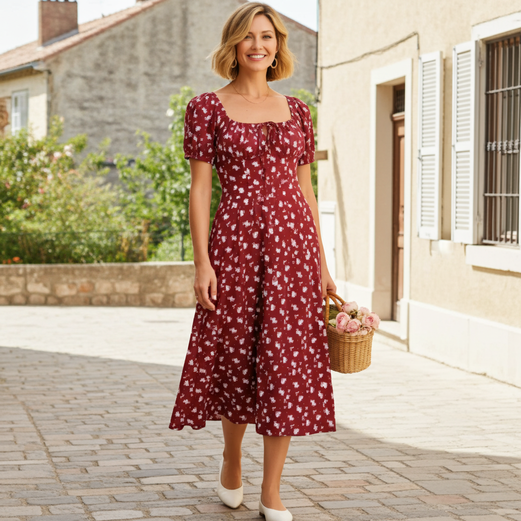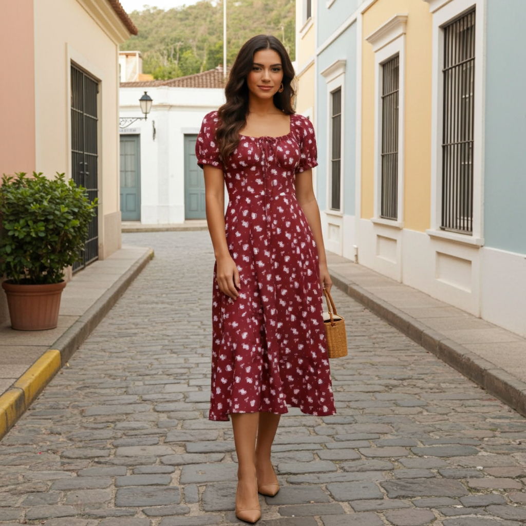 Wine Red Floral Square Neck Puffed Sleeve Midi Dress