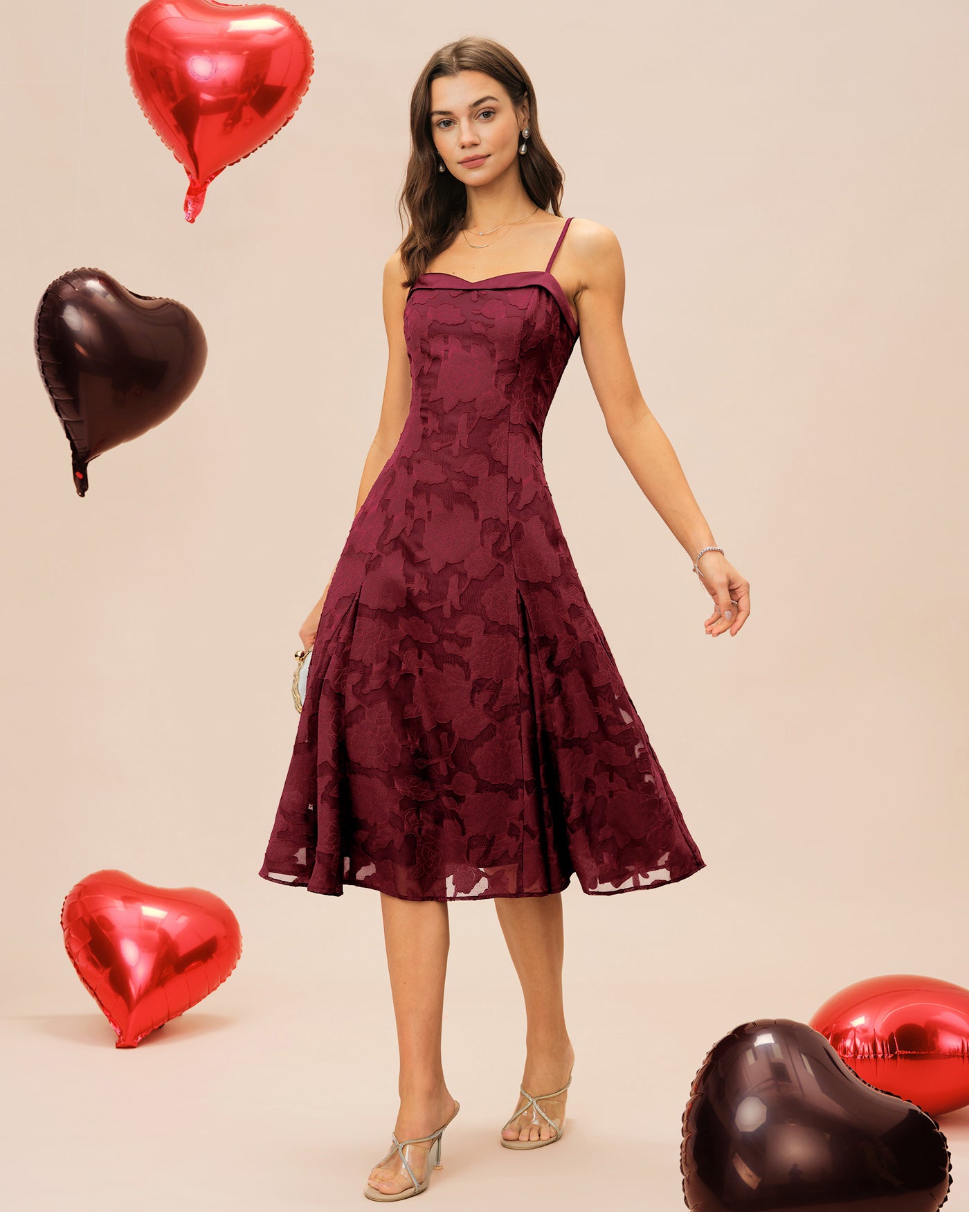 Wine Red Sweetheart Neck Jacquard Slip Midi Dress