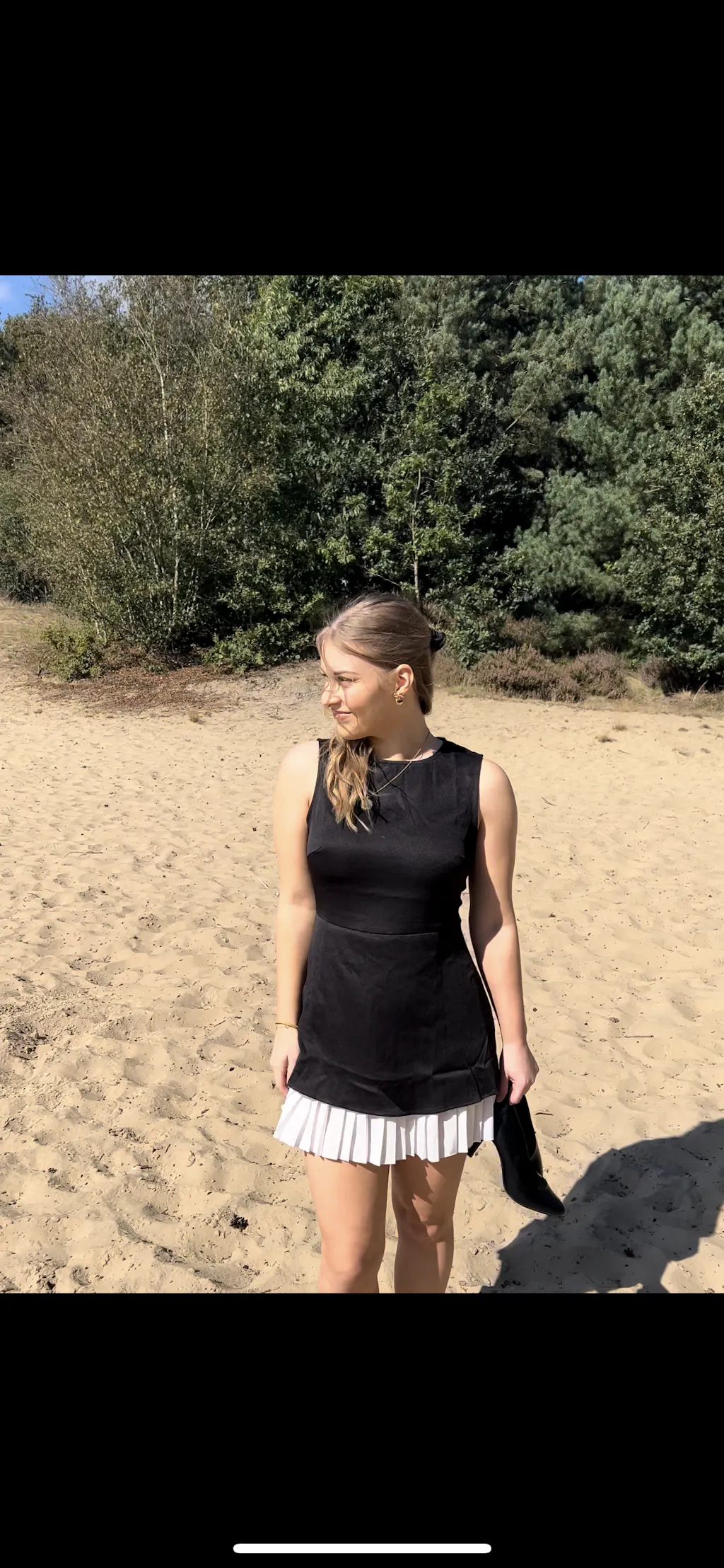 This dress is perfect! The splicing detail is unique and makes it stand out from other black dresses I own. The pleats give it a feminine touch, and I love how it fits. It's just the right length for a mini dress, not too short, and the fabric feels soft and breathable.