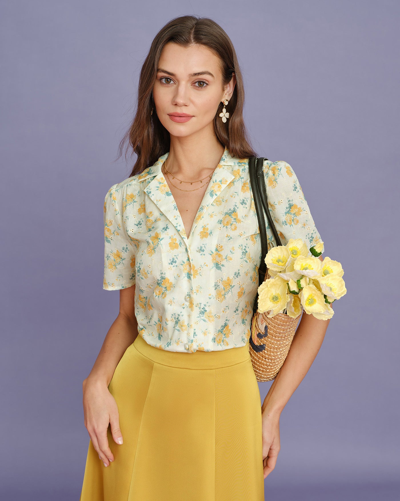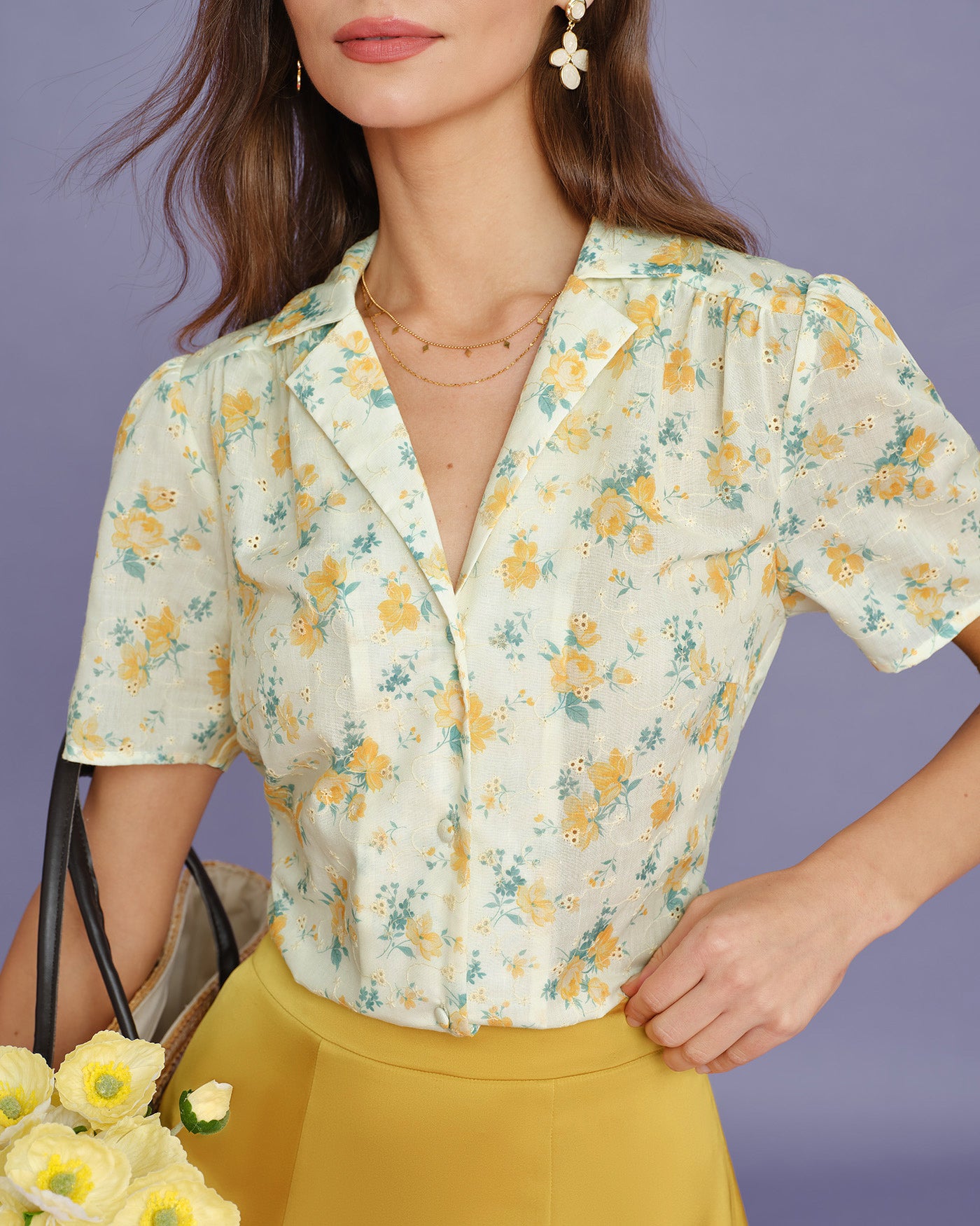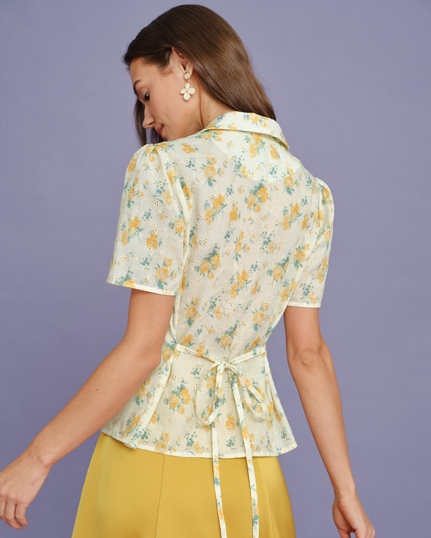 Yellow Collar Puffed Sleeve Floral Blouse