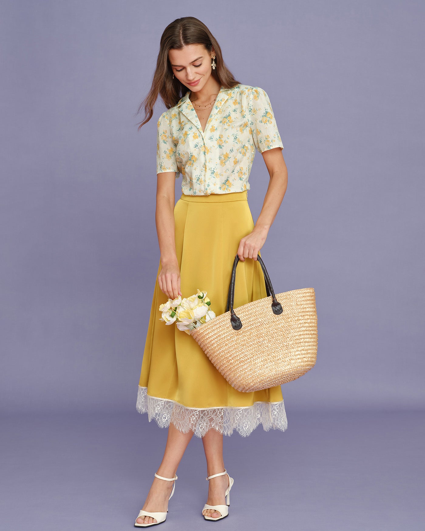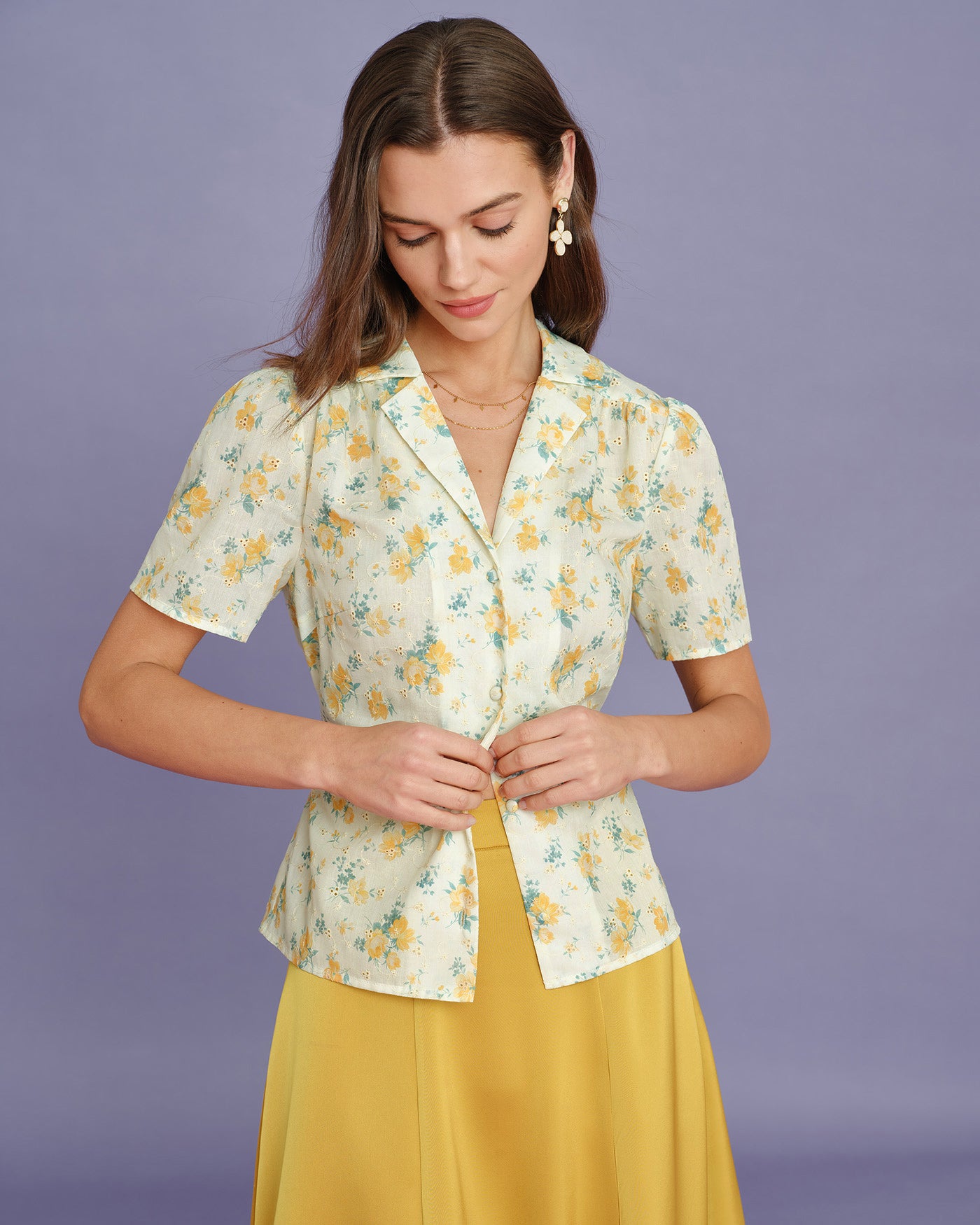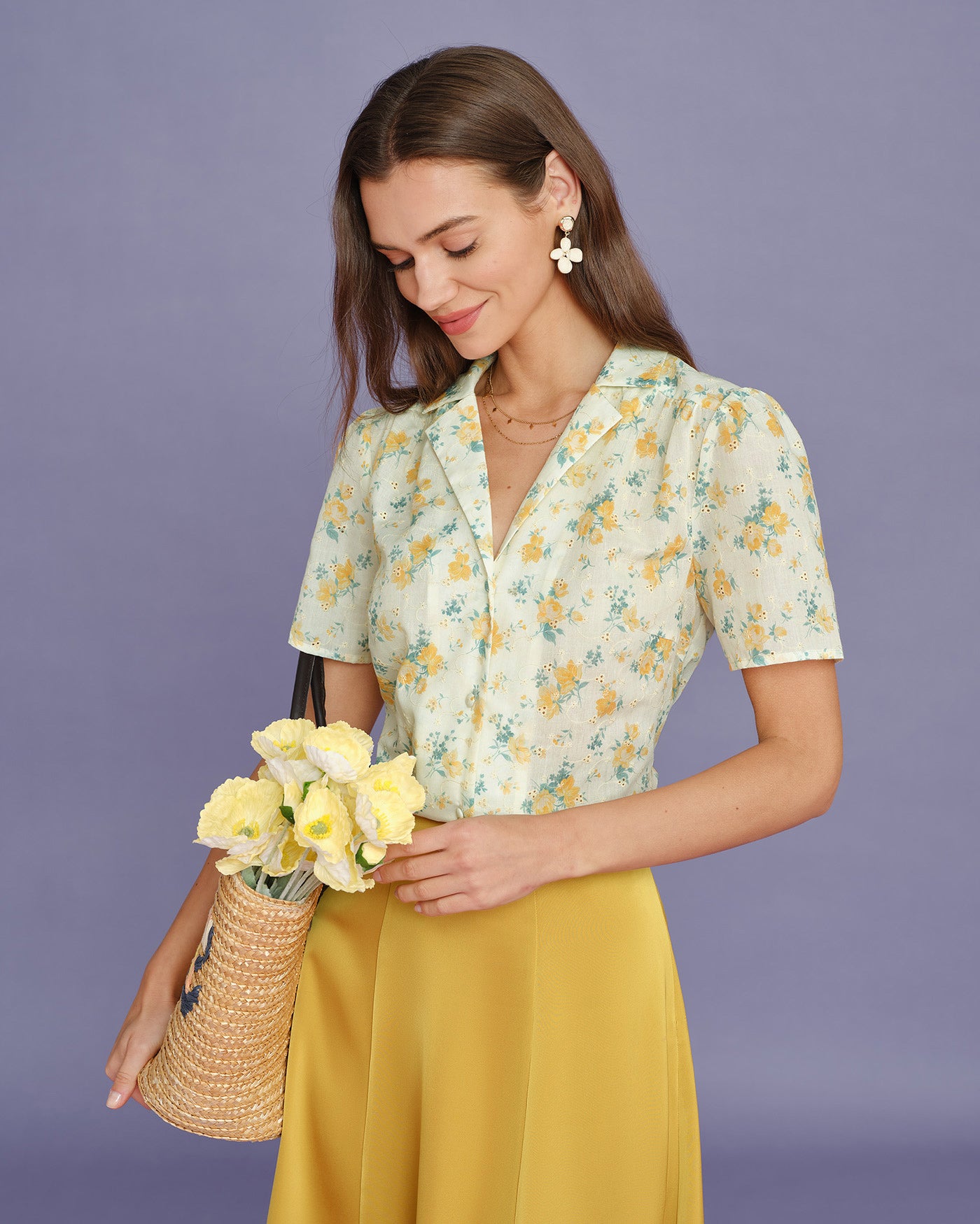 Yellow Collar Puffed Sleeve Floral Blouse
